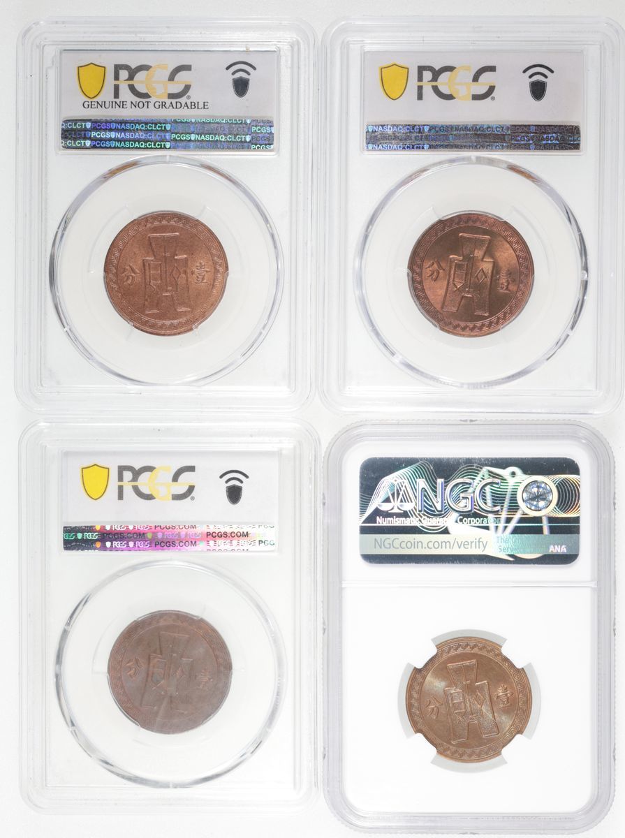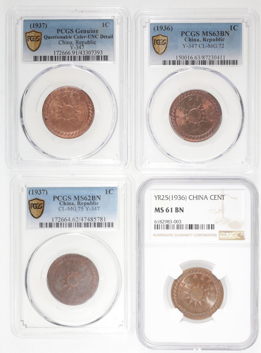 China, Republic, a group of 4x copper 1 cent, Year 25-26 (1936-1937), (Y-347), 1x graded PCGS UNC Detail, Questionable Colour, the rest PCGS MS63BN, MS62BN and NGC MS61BN, the ones with numerical grades all have multi-coloured toning (4)