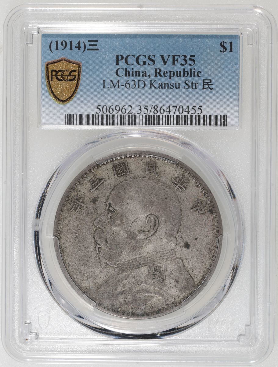 China, Republic, [PCGS VF35] silver dollar, Year 3 (1914), Kansu Issue, 'with a straight stroke on 'Min' character',