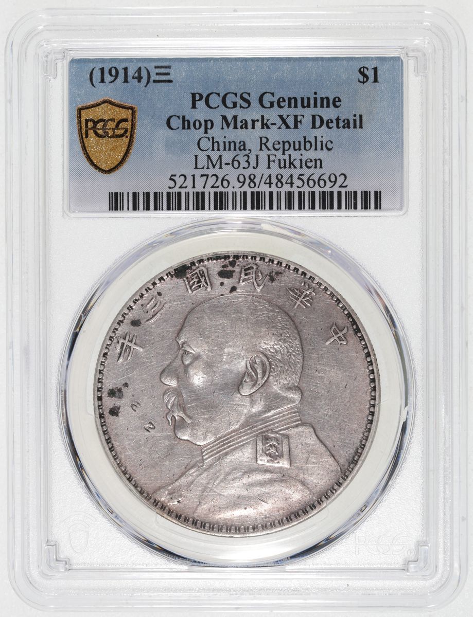 China, Republic, [PCGS XF Detail] silver dollar, Year 3 (1914), 'Fatman Dollar', Fukien issue, (KM-63J)