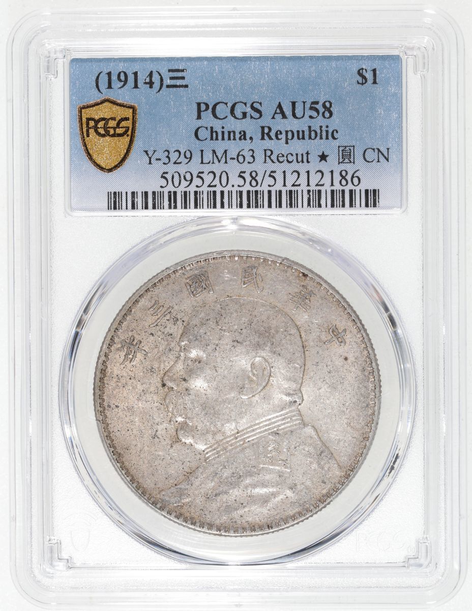 China, Republic, [PCGS AU58] silver dollar, Year 3 (1914), 'recut star and connected yuan' variety, (LM-63), #51212186