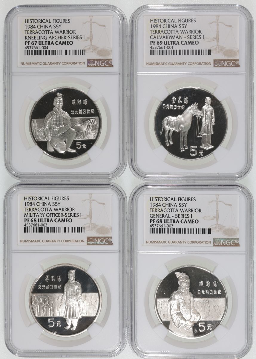 1984年中國歴史建築第一組-兵馬俑銀幣4枚一套,面額5元,NGC PF69, 68, 68, 67 Ultra Cameo