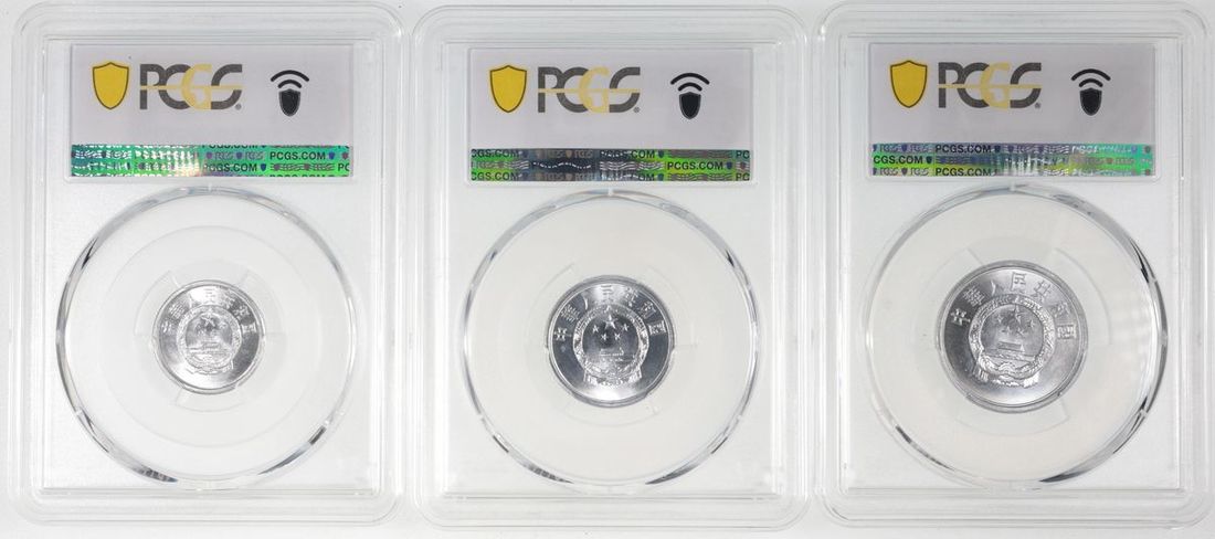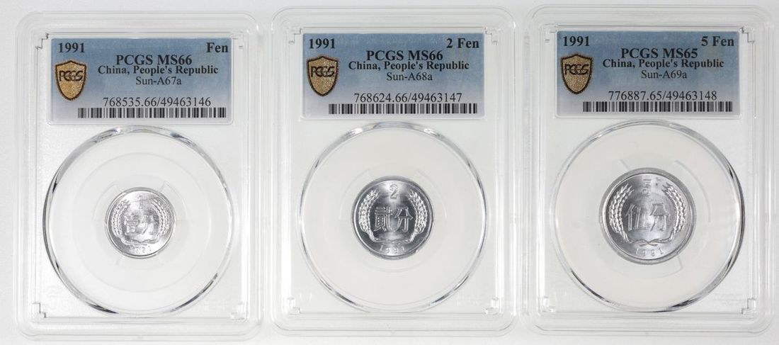 1991年中國鋁幣一組3枚,包括1分,2分及5分,分別評為PCGS MS66,66及65