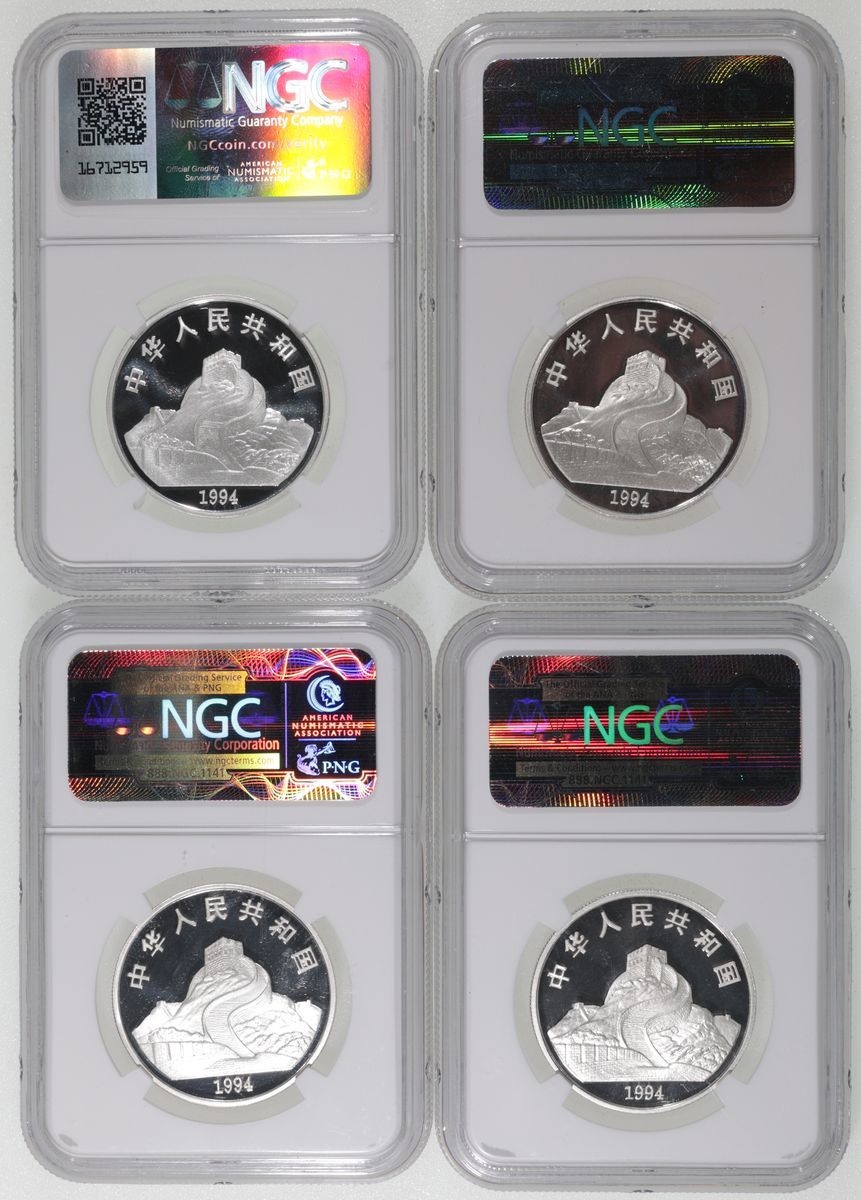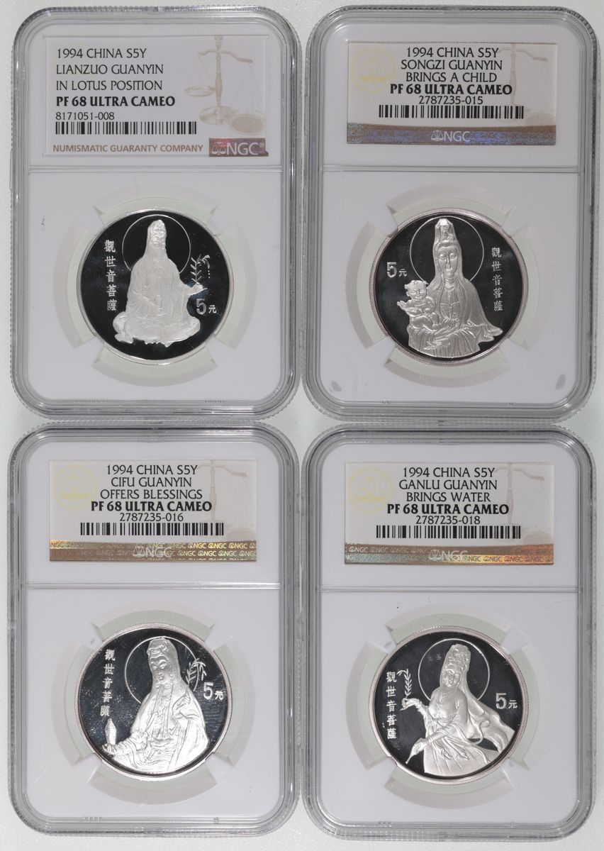 People's Republic of China, [NGC PF68 Ultra Cameo] set of 4x silver proof 5 yuan, 1994, Guanyin, 'Cifu Guanyin Offers Blessings', 'Songzi Guanyin Brings a Child', 'Ganlu Guanyin Brings Water' and 'Lianzuo Guanyin In Lotus Position', each weighing 0.5oz, ASW 2oz, cert. #2787235-016, -015, -018 and 8171051-008, limited mintage of only 3000 (4)