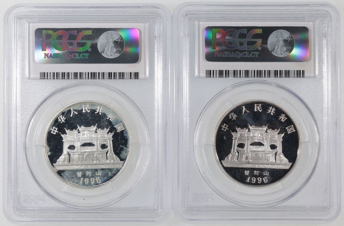 People's Republic of China, [PCGS PR68DCAM] a pair of silver proof 5 yuan, 1996, 'Guanyin with Jade Vase' and 'Guanyin with Golden Lotus', each weighing 0.5oz, ASW 1oz, cert. #26385725, 26385742, limited mintage of 5000, with original certificate of issue, sold as seen, no returns (2)