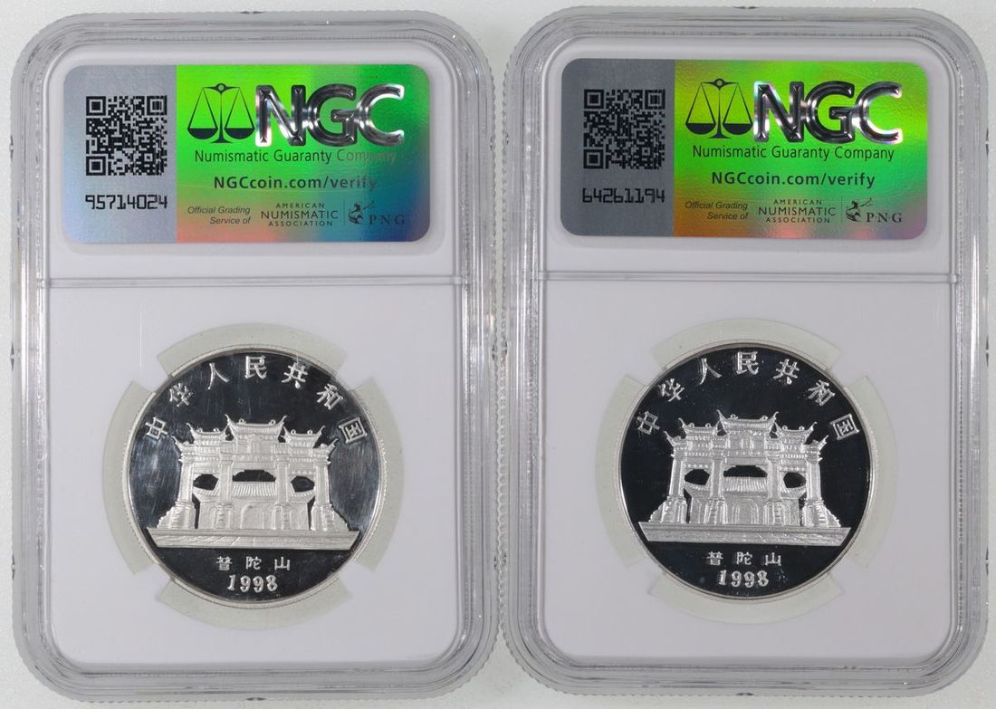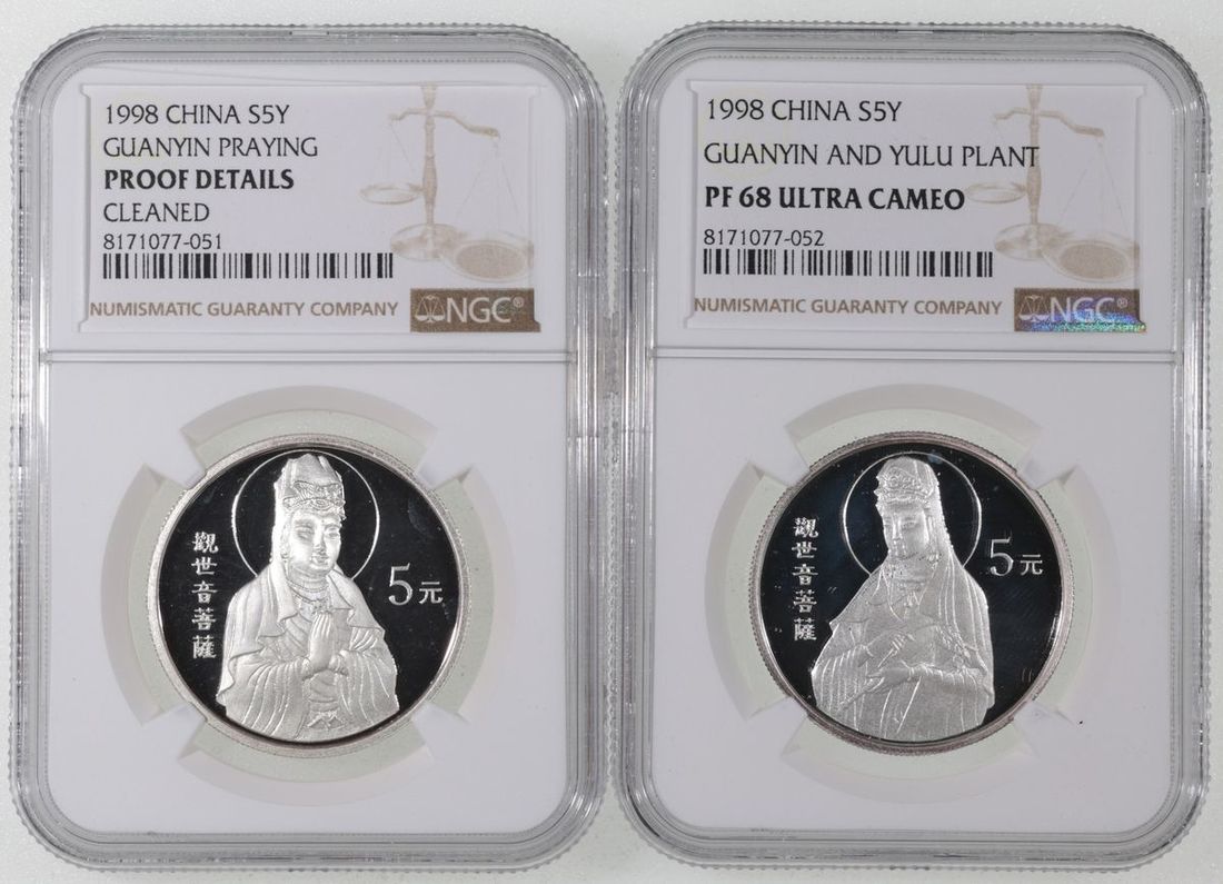1998年中國5元觀音精鑄銀幣一組2枚,NGC PF68UC 及 NGC Proof Details,有清洗,發行量10000枚