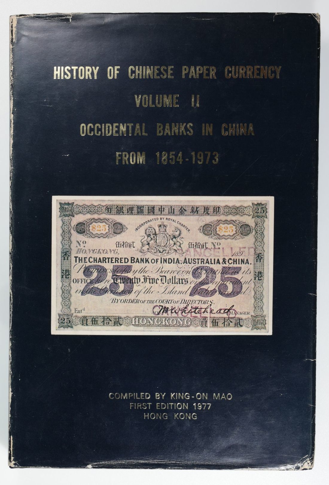 China, Literature, History of Chinese Paper Currency, Volume II, Occidental Banks in China from 1854-1973, compiled by King-On MAO, 1st Edition, 1977, Hong Kong, with price guide, some damage from use on the cover, otherwise well kept. Interesting