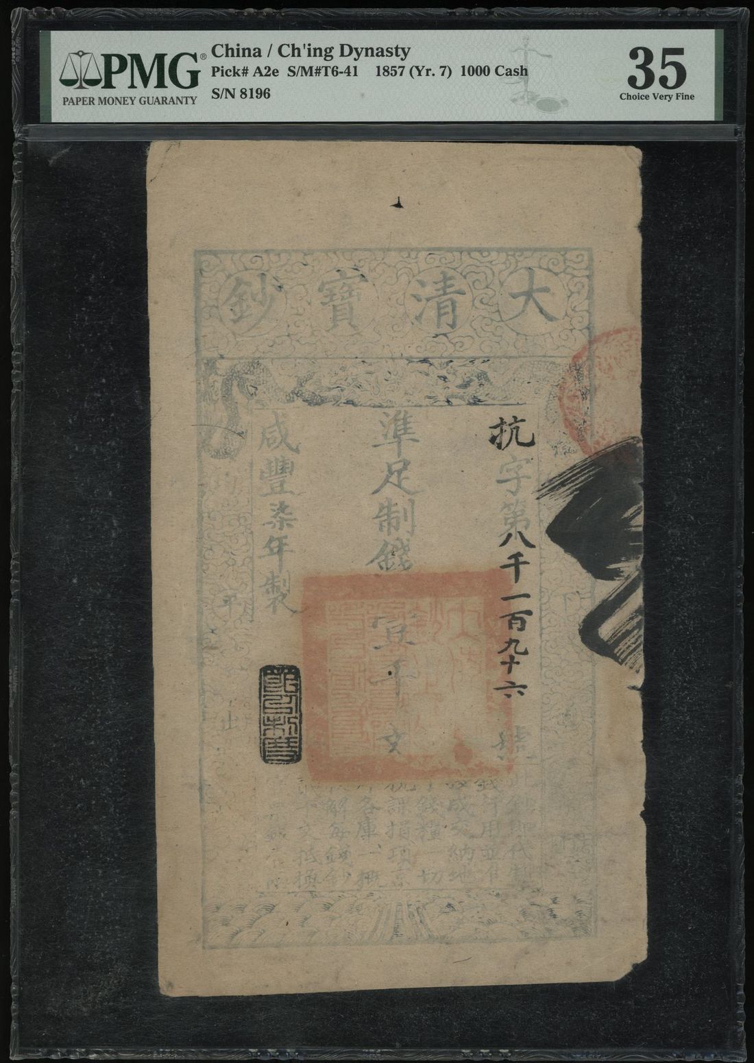 China, Qing Dynasty, 'Da Qing Bao Chao', 1000 cash, Xianfeng Year 7(1857), serial number 8196, (Pick A2e), PMG 35, choice very fine, edge damage.