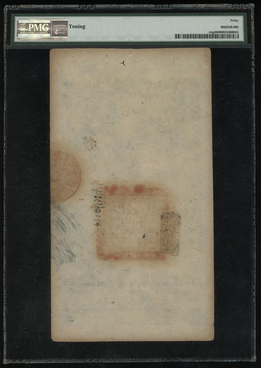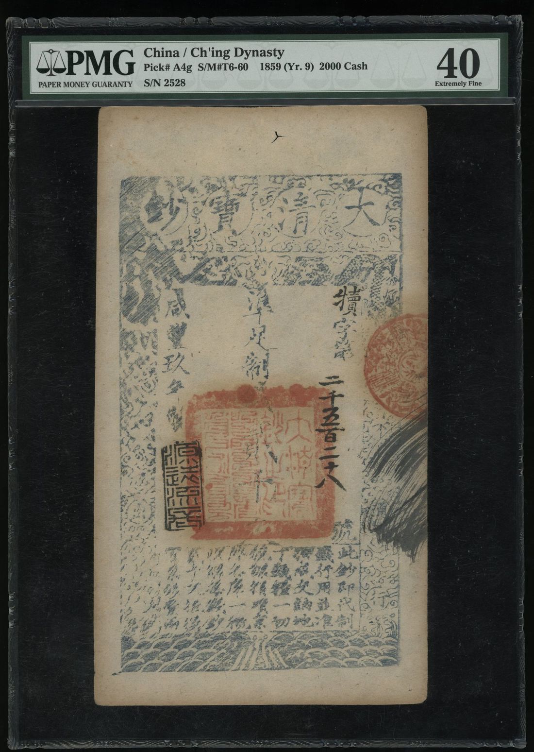 China, Qing Dynasty, 'Da Qing Bao Chao', 2000 cash, Xianfung Year 9 (1859), serial number 2528, (Pick A4g), PMG 40, toning.