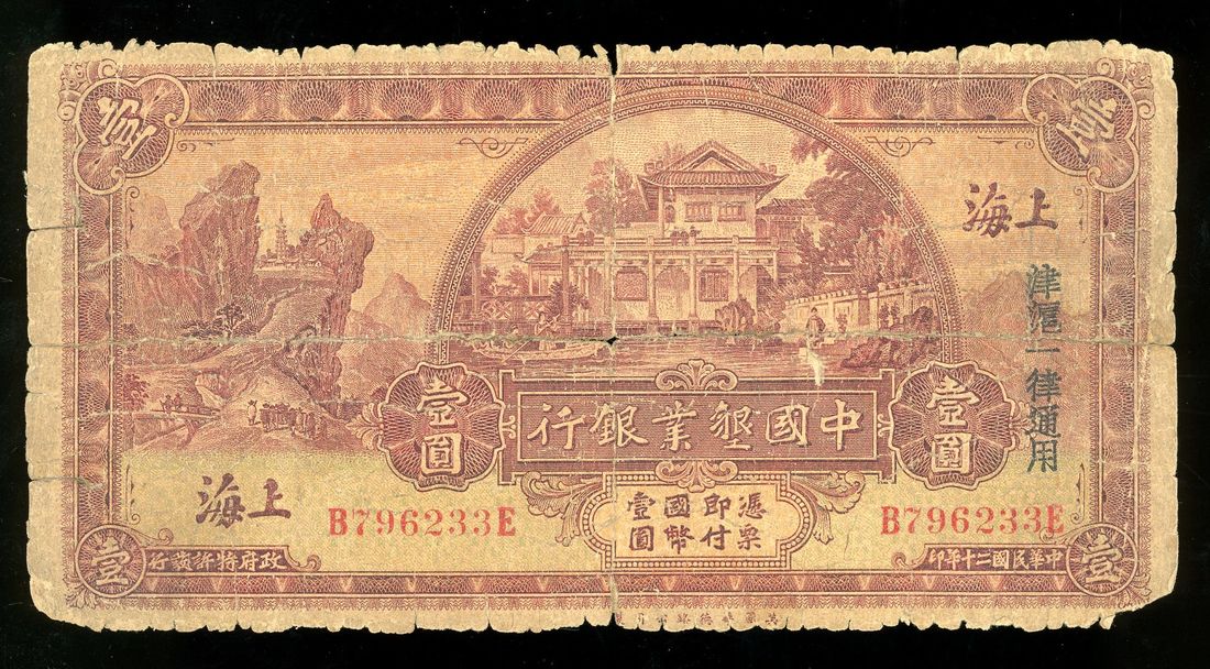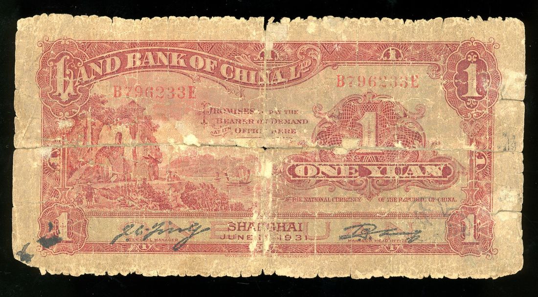 Land Bank of China, 1 yuan, 1931, Shanghai, serial number B 796233 E, (Pick 504), Good. Tears at Edges
