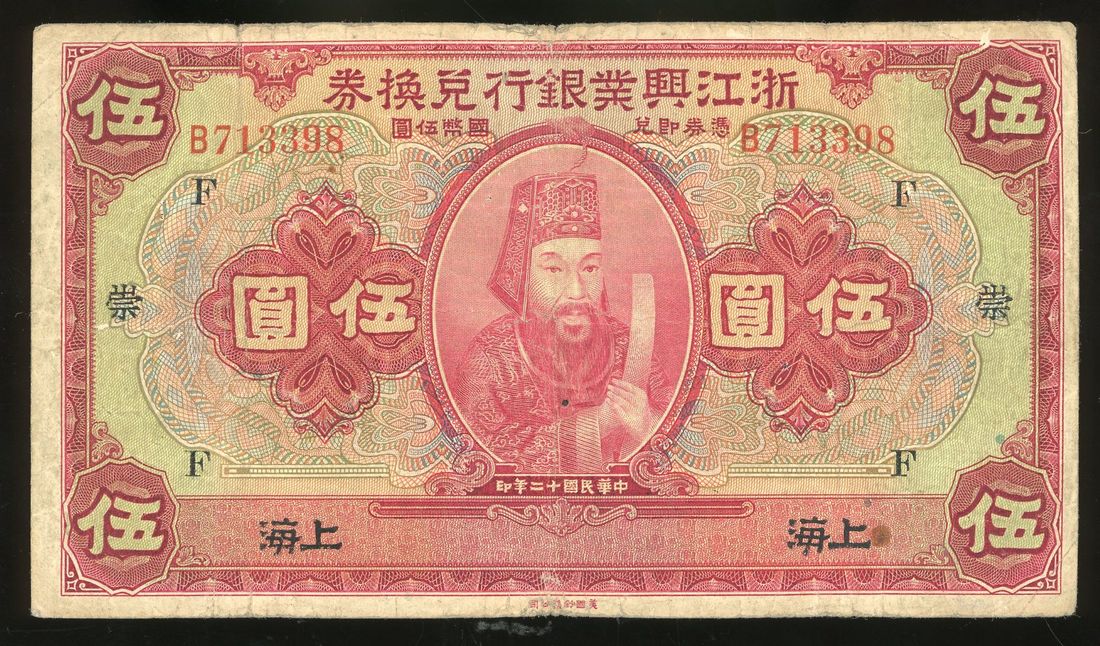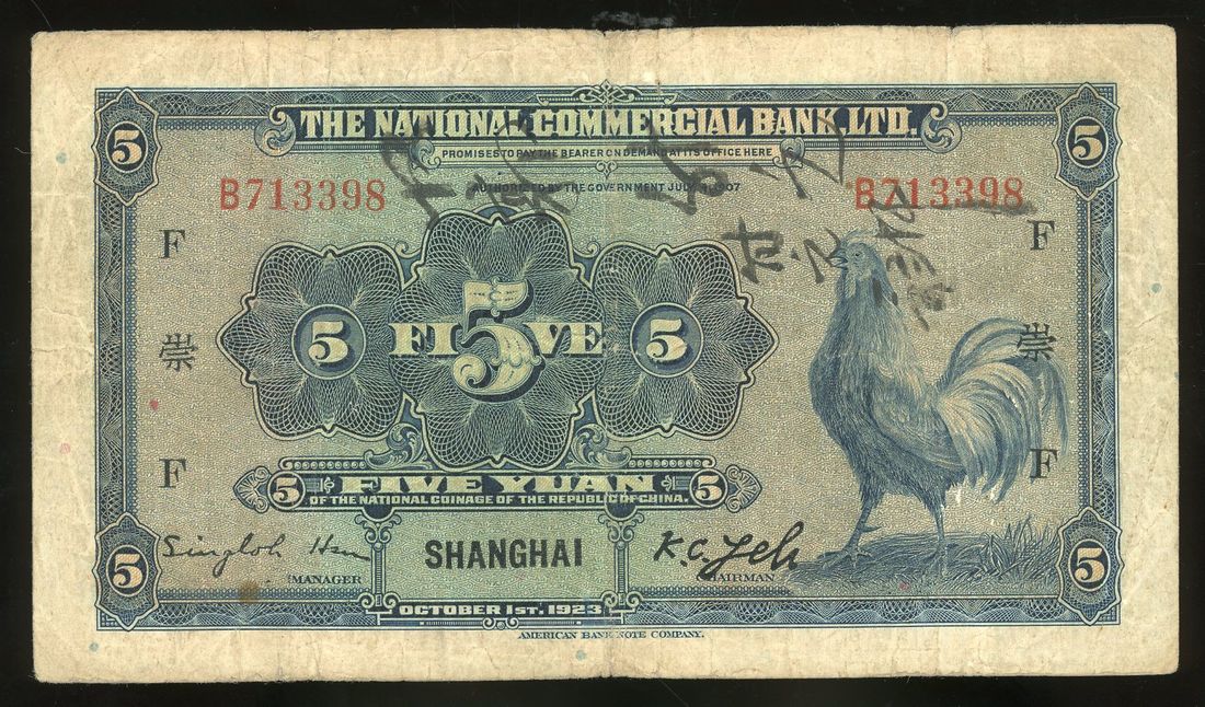 National Commercial Bank, China, 5 yuan, Year 12 (1923), Shanghai, serial number B713398, (Pick 518) fine