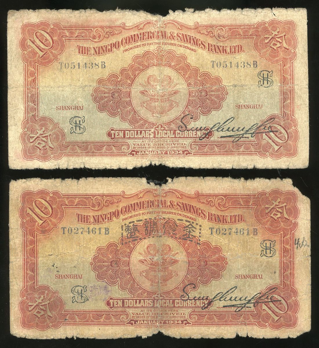 Ningpo Commercial & Savings Bank Ltd, China, 10 yuan (2), Year 23 (1934), 1x with "Finacial reorganisation" stamp, (Pick 550), very good (2)