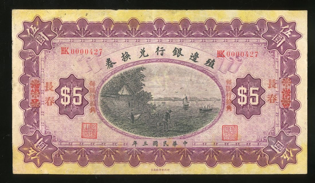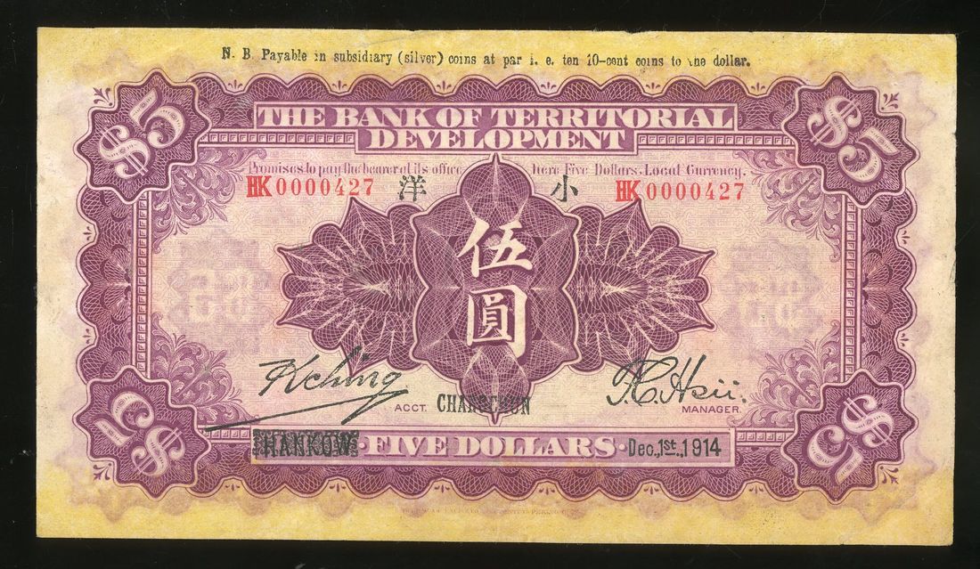 Bank of Territorial Development, China, 5 yuan, Year 3 (1914), Changchun overprinted on Hankow, serial number HK0000427, (Pick 567), pressed, extremely fine