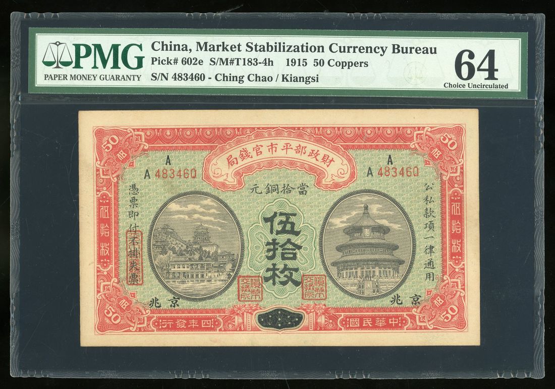 Market Stabilisation Currency Bureau, China, 50 coppers, Year 4 (1915), Ching Chao, serial number 483460, (Pick 602e), PMG 64