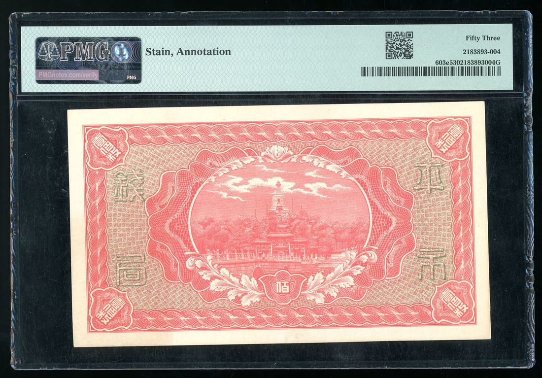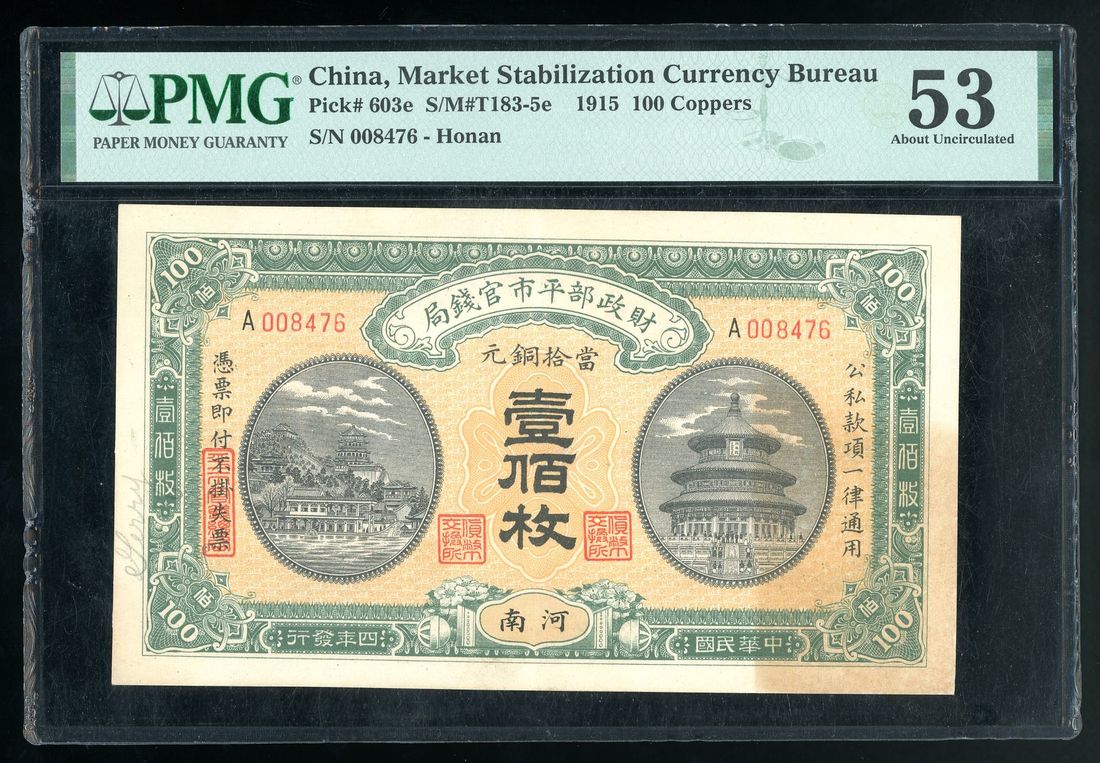 Market Stabilization Currency Bureau, China, 100 coppers, Year 4 (1915), serial number A008476, (Pick 603e), PMG 53, stain, annotation