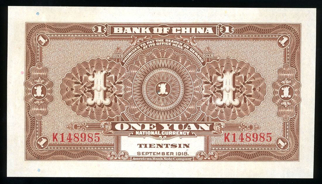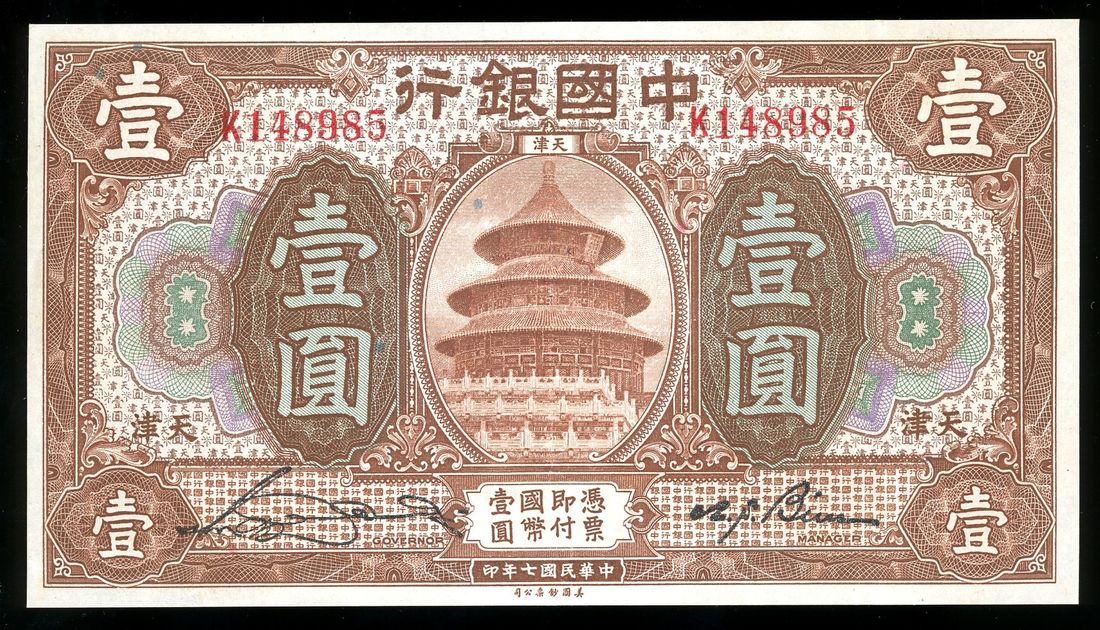 Bank of China, 1 yuan, Year 7 (1918), Tientsin, serial number K148985, (Pick 51q), lightly pressed, about uncirculated