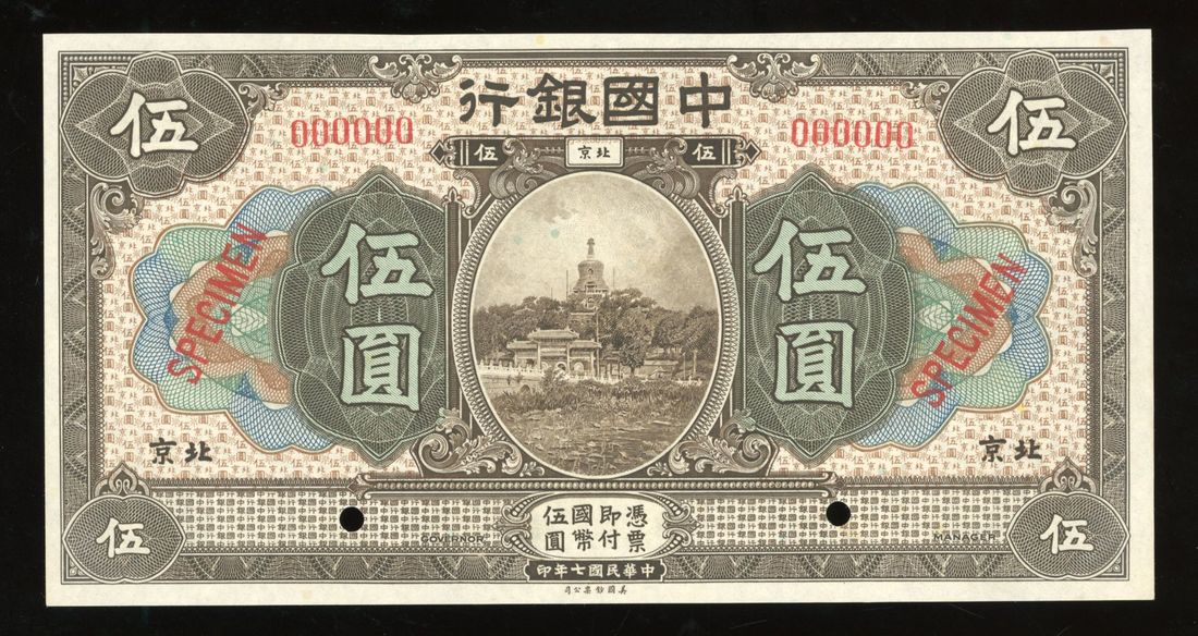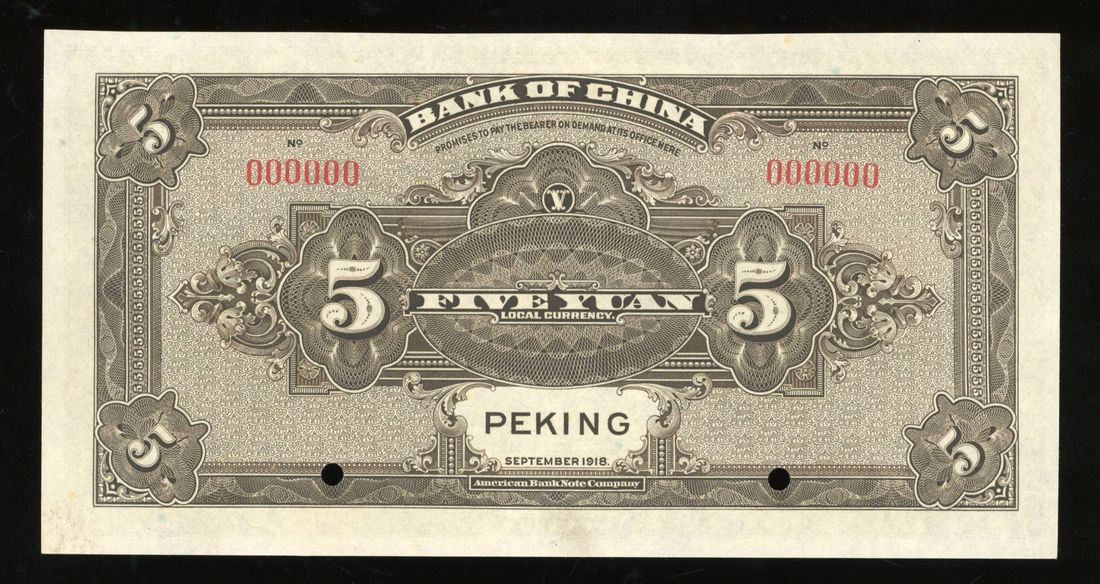 Bank of China, specimen 5 yuan, Peking, Year 7(1918), serial number 000000, printed by ABNC,