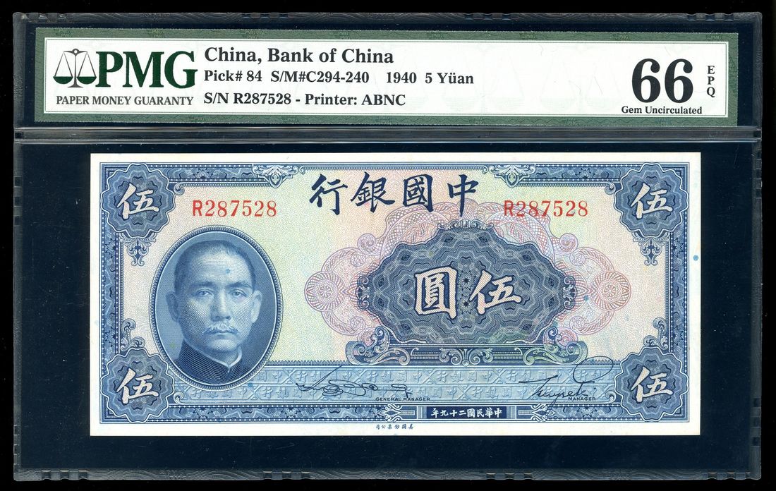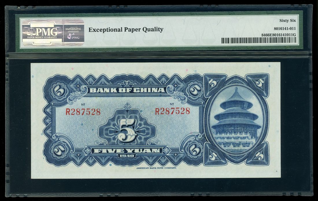 Bank of China, 5 yuan, 1940, serial number R 287528, (Pick 84), PMG 66EPQ