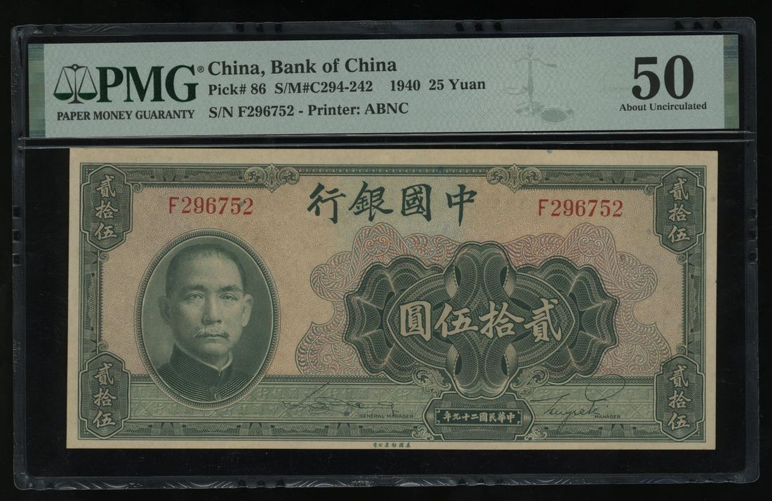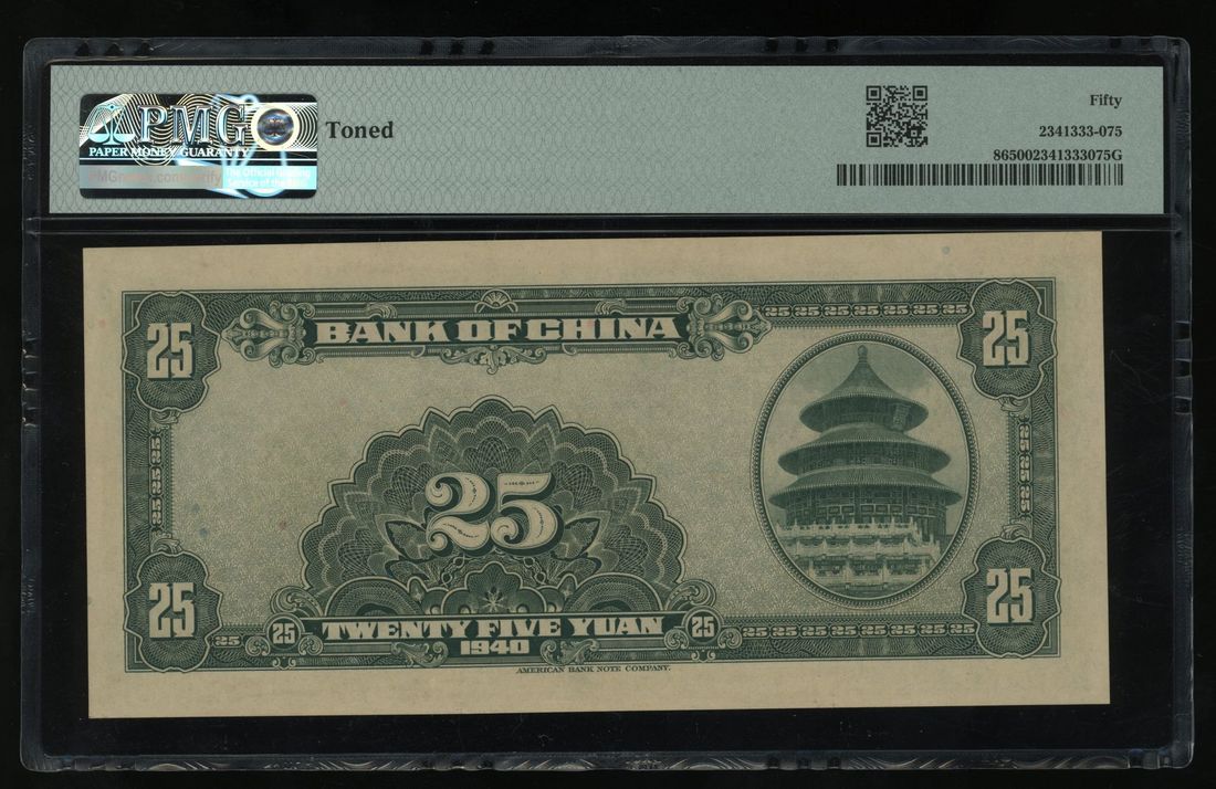 Bank of China, 25 yuan, 1940, serial number F296752, (Pick 86), PMG 50, toned