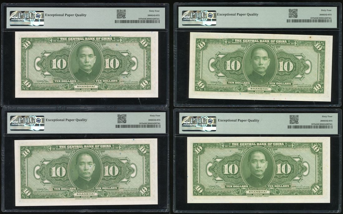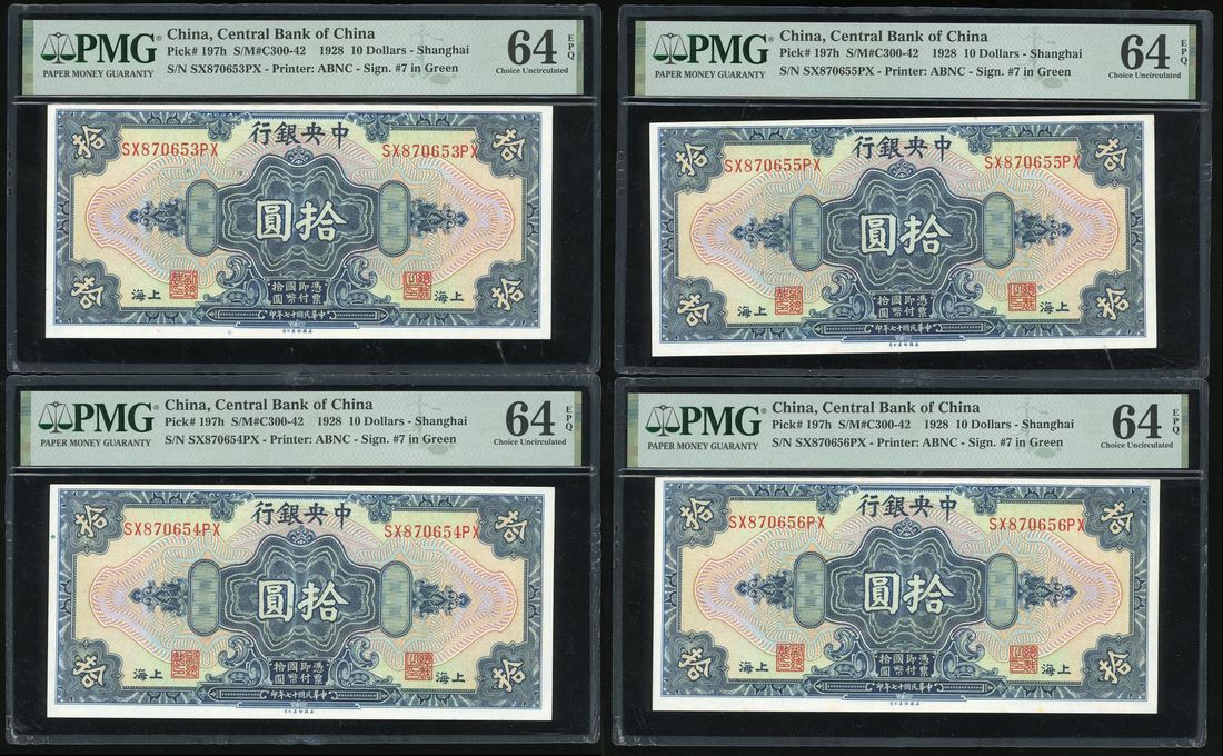 Central Bank of China, consecutive 10 yuan, Year 17 (1928), serial numbers SX870653-56PX, (Pick 197h), all PMG 64EPQ (4)