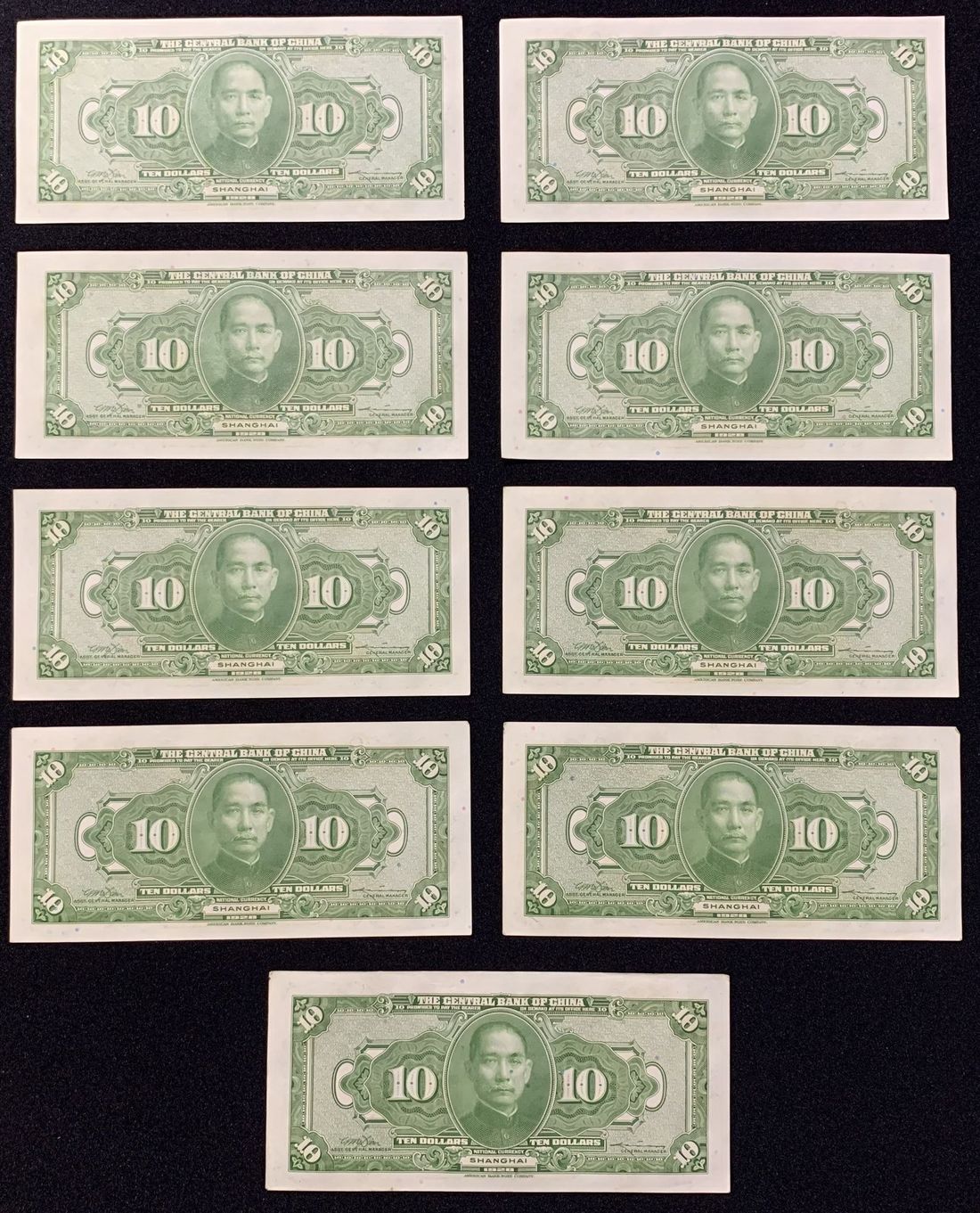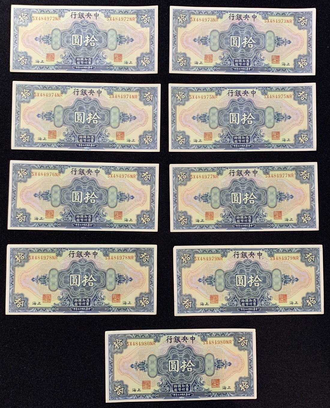 Central Bank of China, consecutive 10 yuan, 1929, serial numbers SX484972NR-980NR green signatures