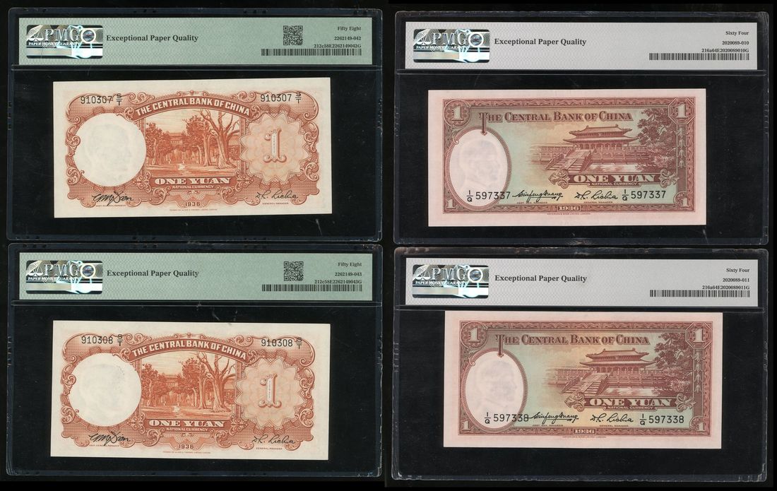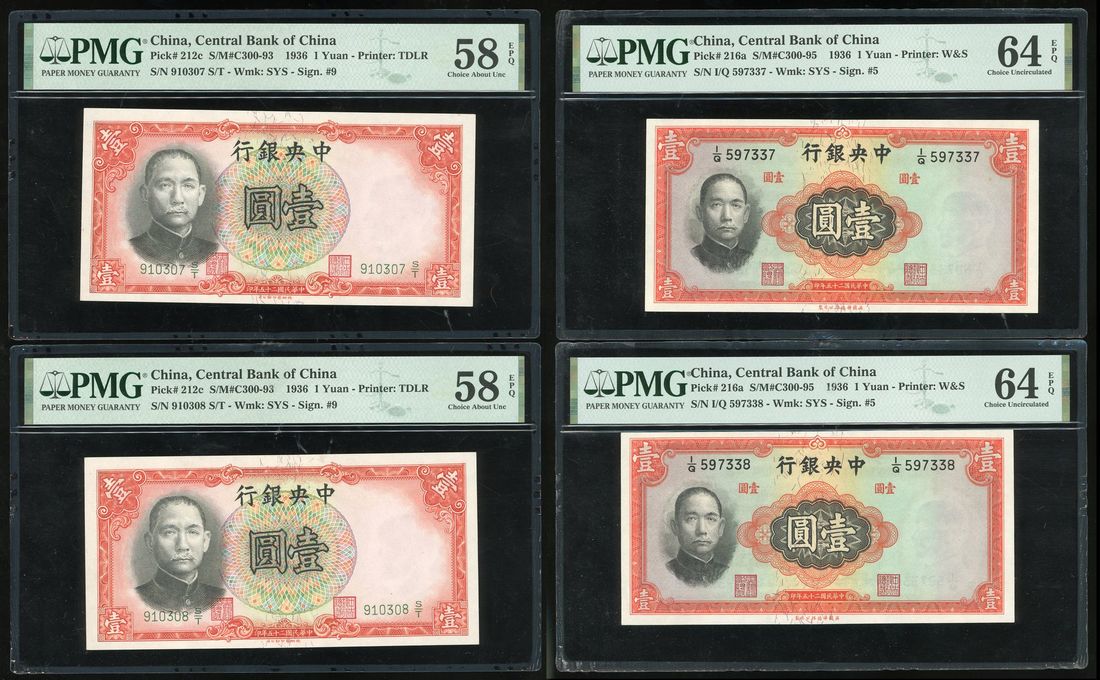 Central Bank of China, 1 yuan (4), Year 25 (1936), includes 2x consecutive pair of Waterlow and DLR printings, (Pick 212c, 216a), PMG 58EPQ, 58EPQ and 64EPQ, 64EPQ (4)