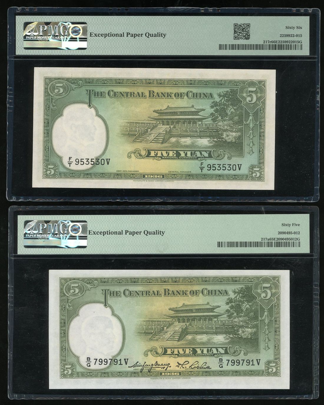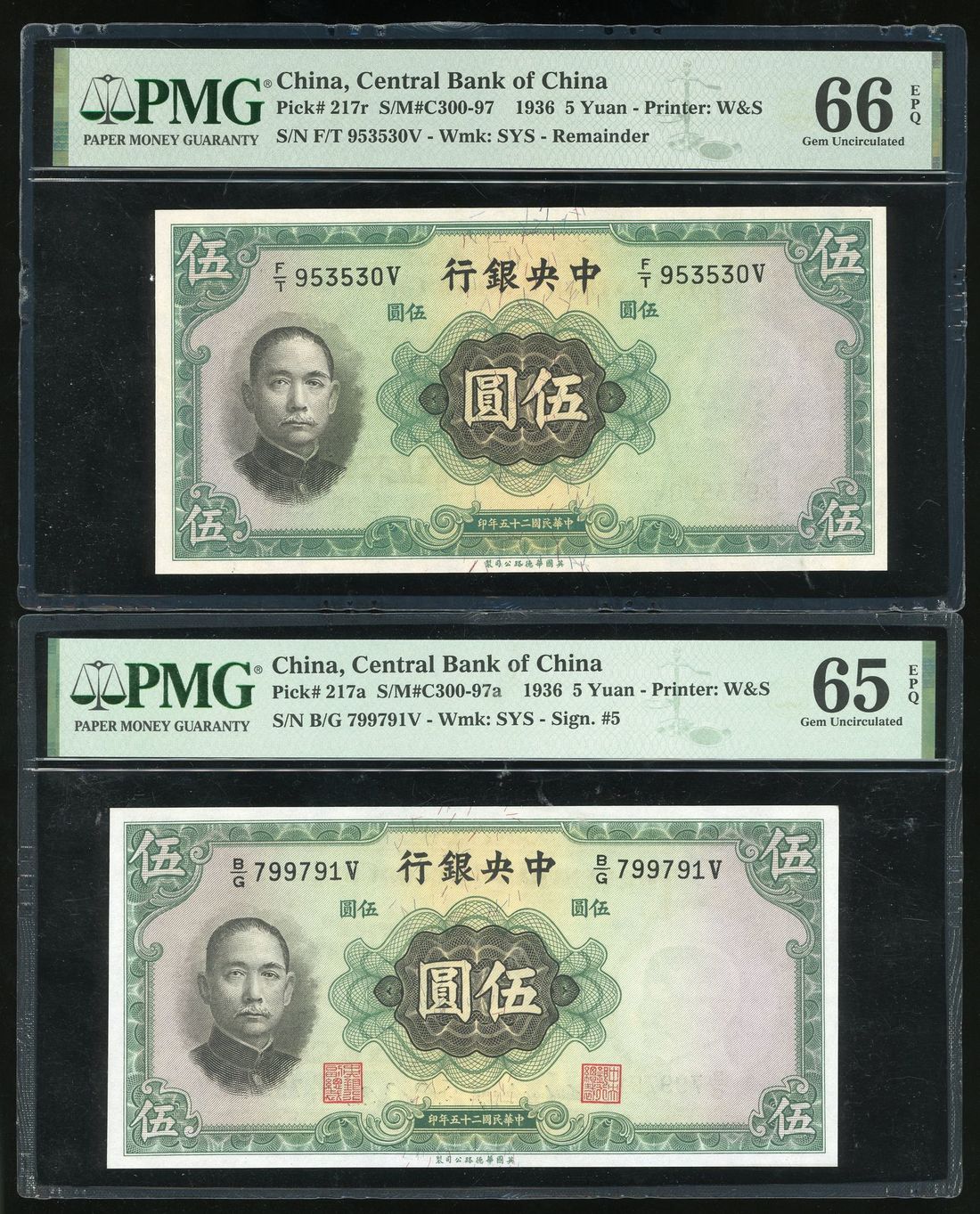 Central Bank of China, 5 yuan (2), Year 25 (1936), issued and remainder, (Pick 217a, 217r), PMG 65EPQ, 66EPQ (TOP POP) (2)
