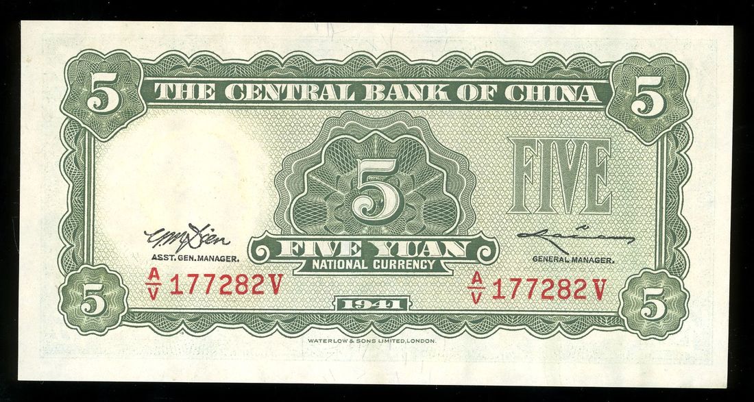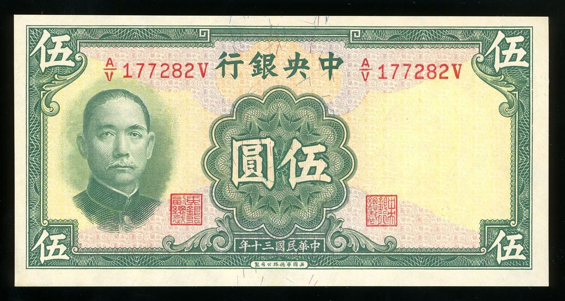 Central Bank of China, 5 yuan, Year 30 (1941), serial number A/V 133282V, (Pick 233), lightly pressed, about uncirculated