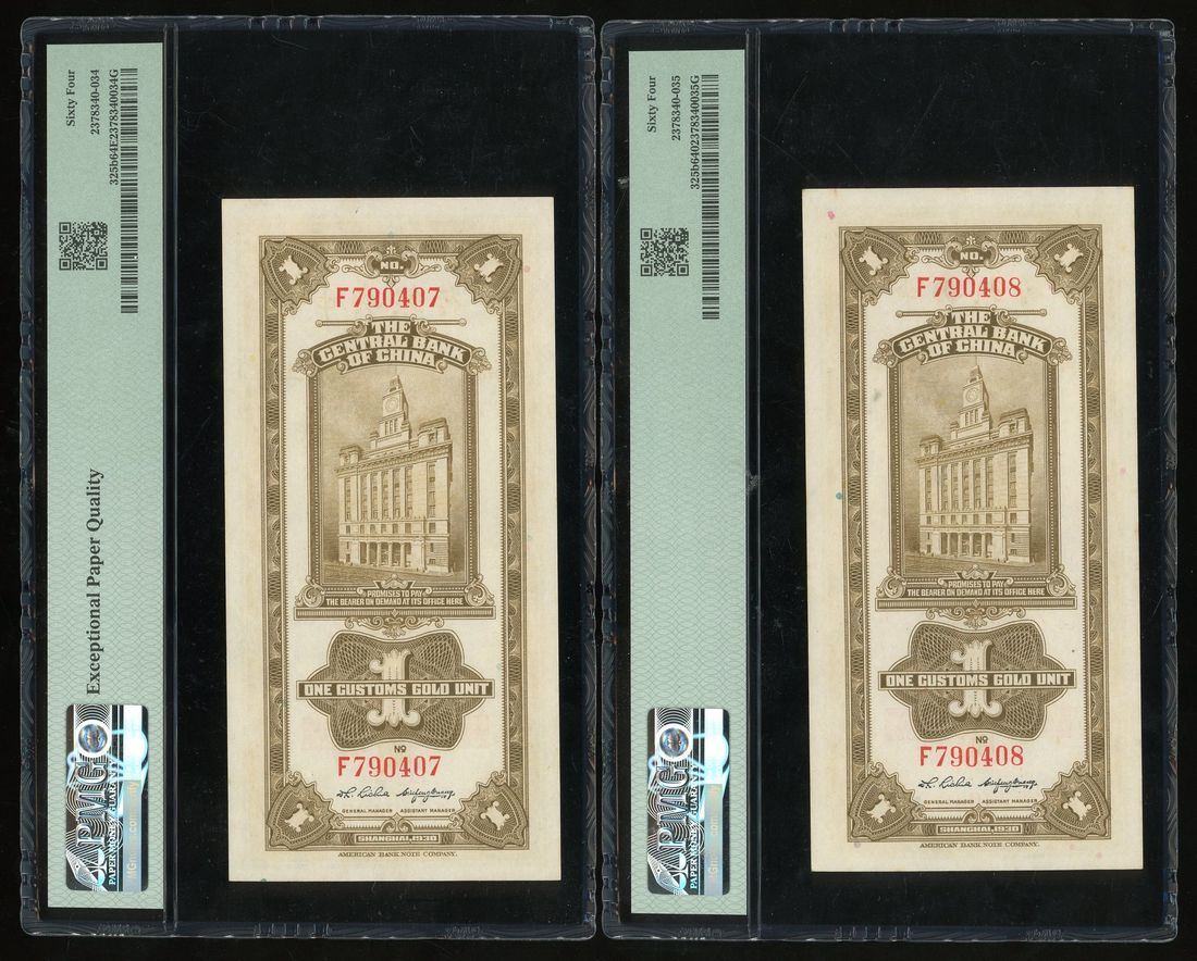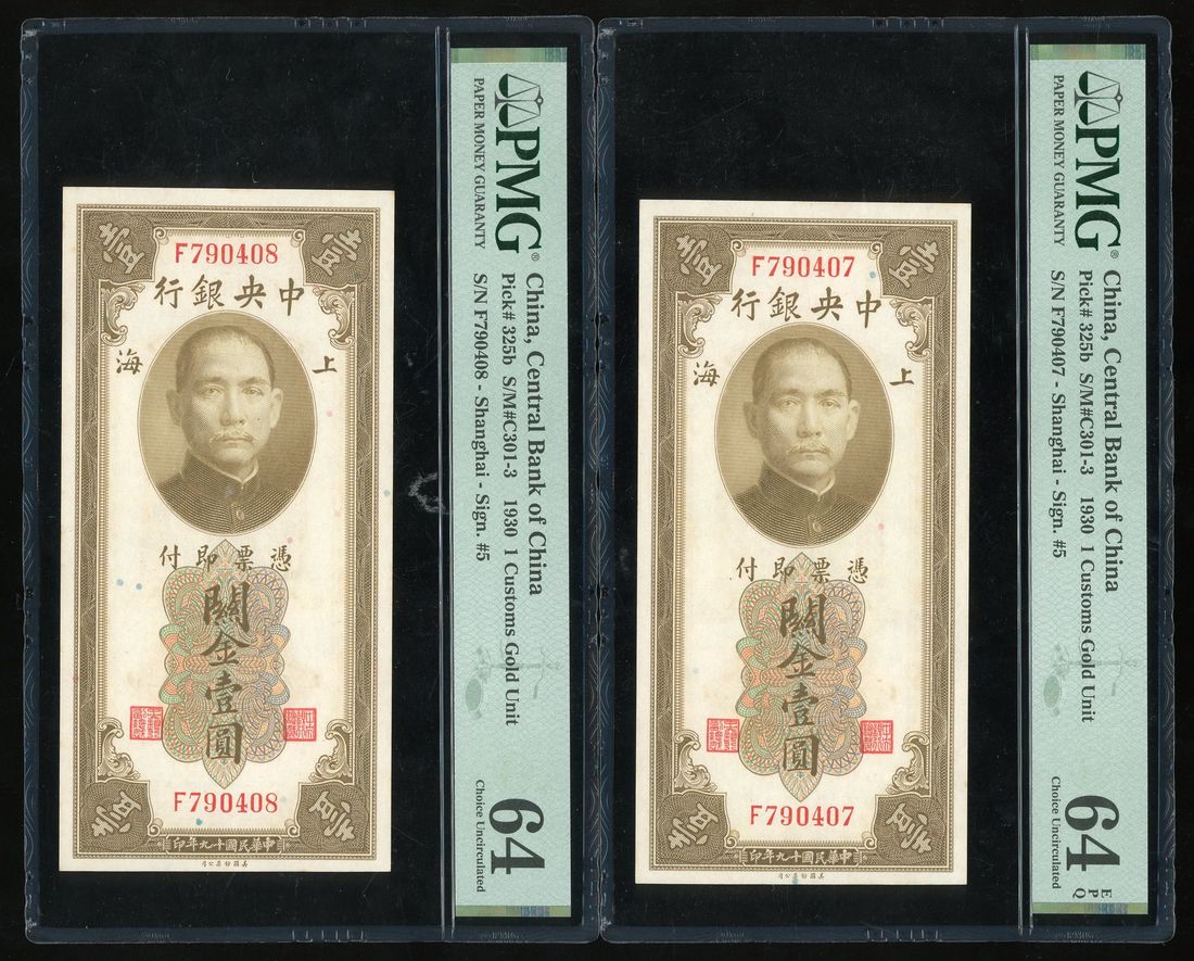 Central Bank of China, consecutive pair 1 customs gold unit, Year 19 (1930), serial numbers F790407/8, (Pick 325b), PMG 64EPQ and 64 respectively (2)
