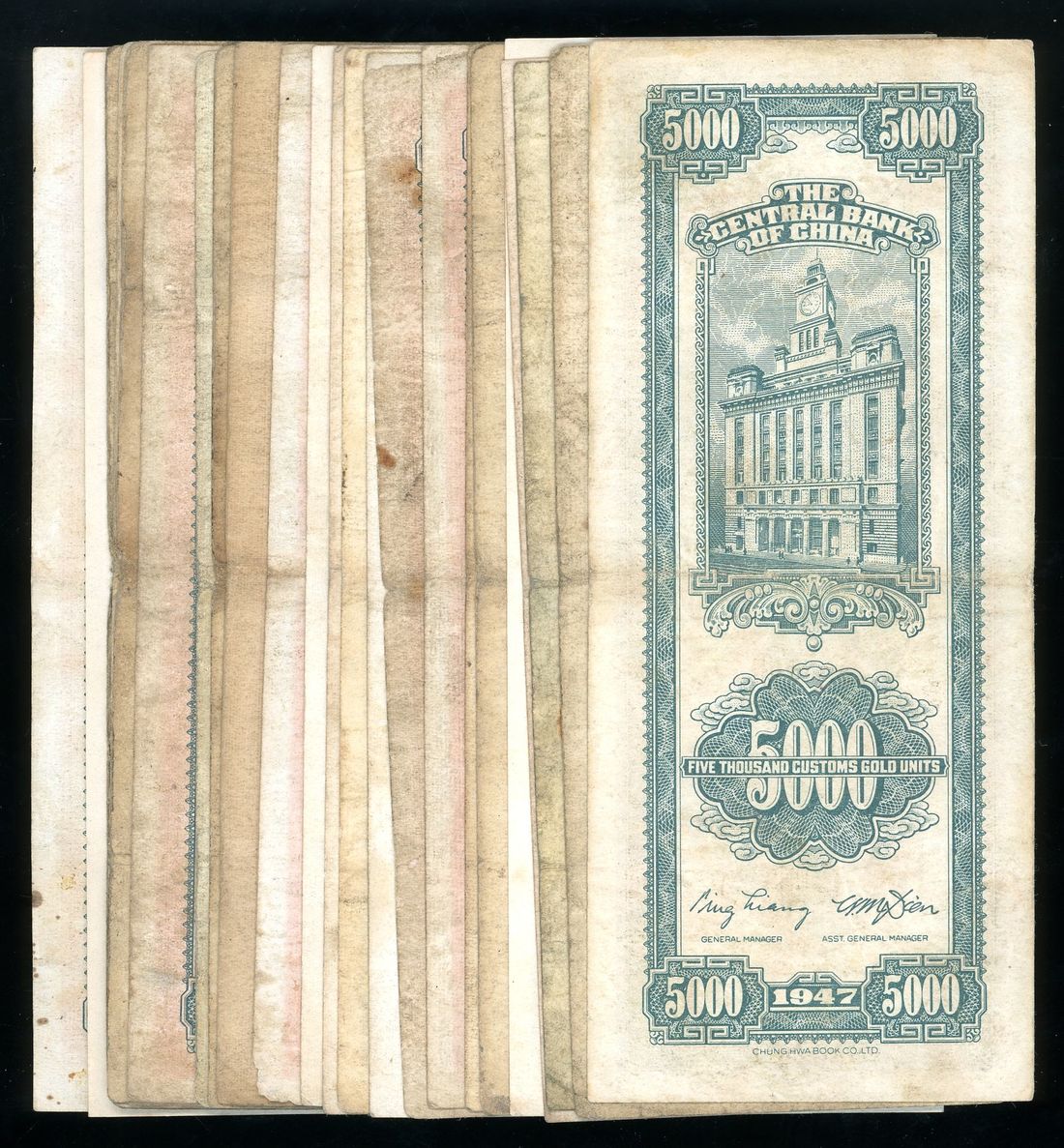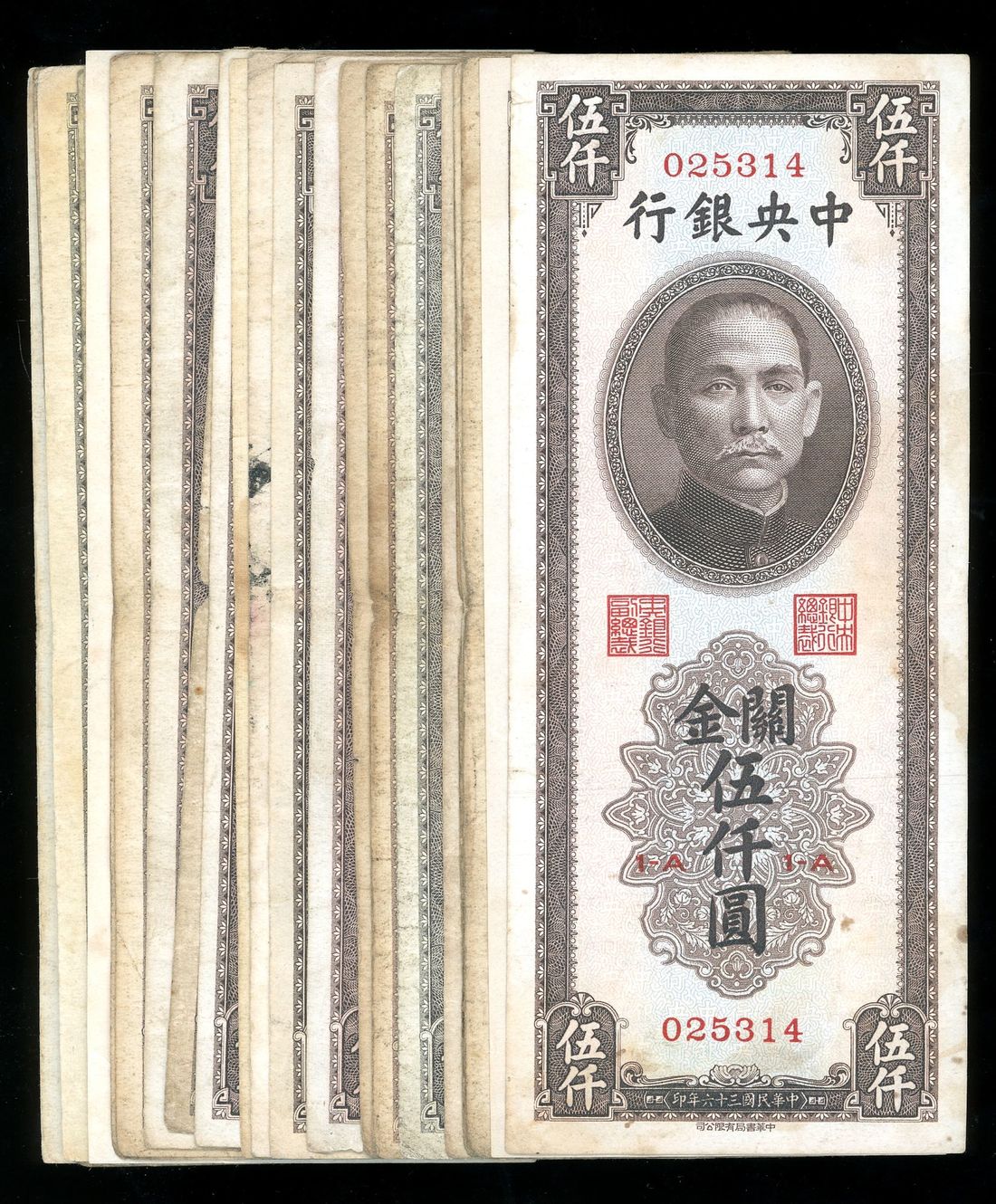 Central Bank of China, a lot of 24x 5000 CGU, 1947, block number from 1-A to 1-Z, vertical format, brown, Sun Yat Sen at top centre,
