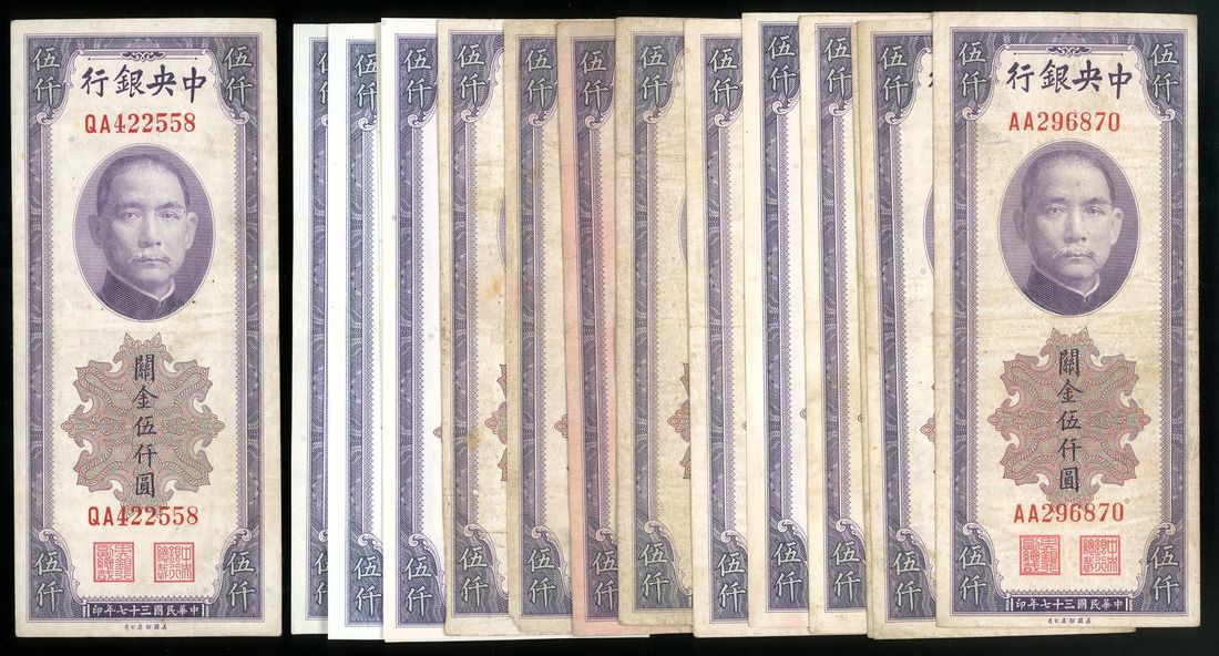 Central Bank of China, a lot of 40x 5000 CGU, 1948, block number from A to Z, without prefix and double prefix AA to QA, vertical format, violet, Sun Yat Sen at top centre,