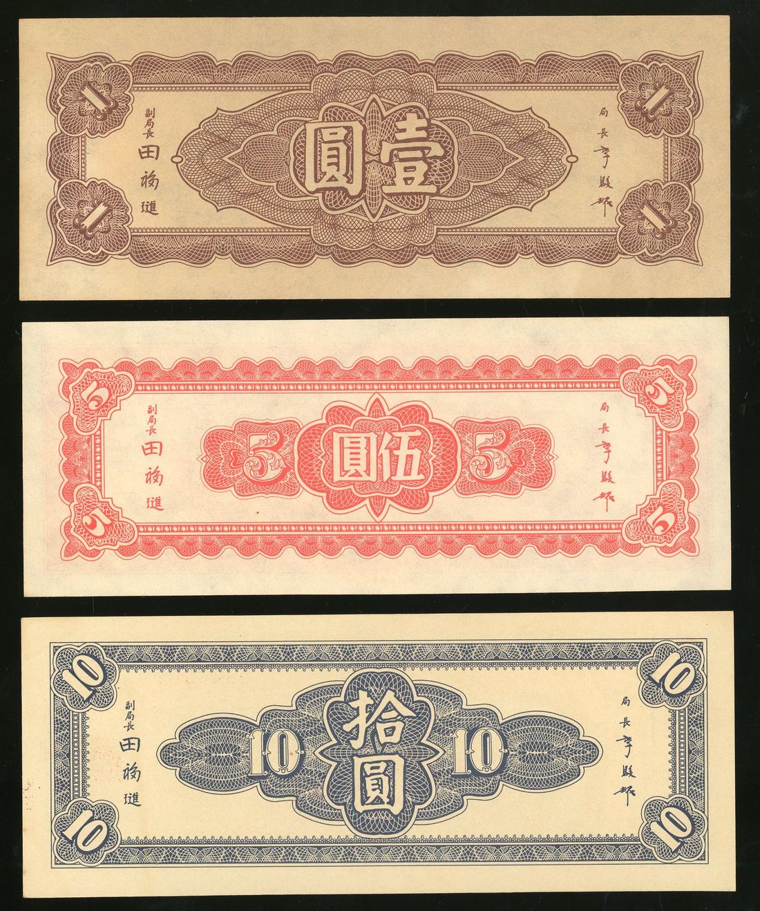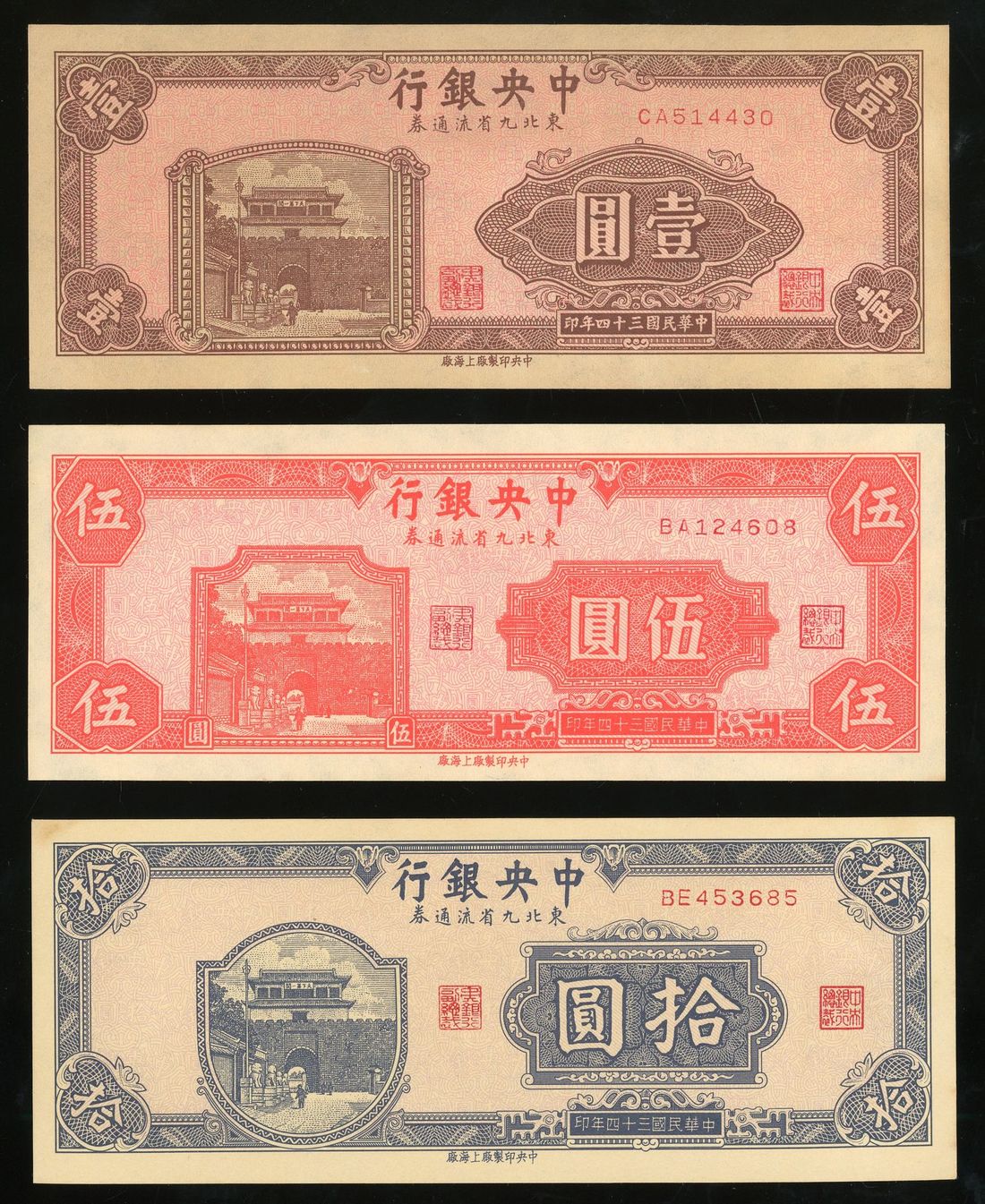 Central Bank of China, Nine Northeastern Provinces Branch, 1, 5 and 10 yuan, 1945, serial number CA514430, BA124608, BE453685, brown, orange and blue, Shanhaiguan at left,
