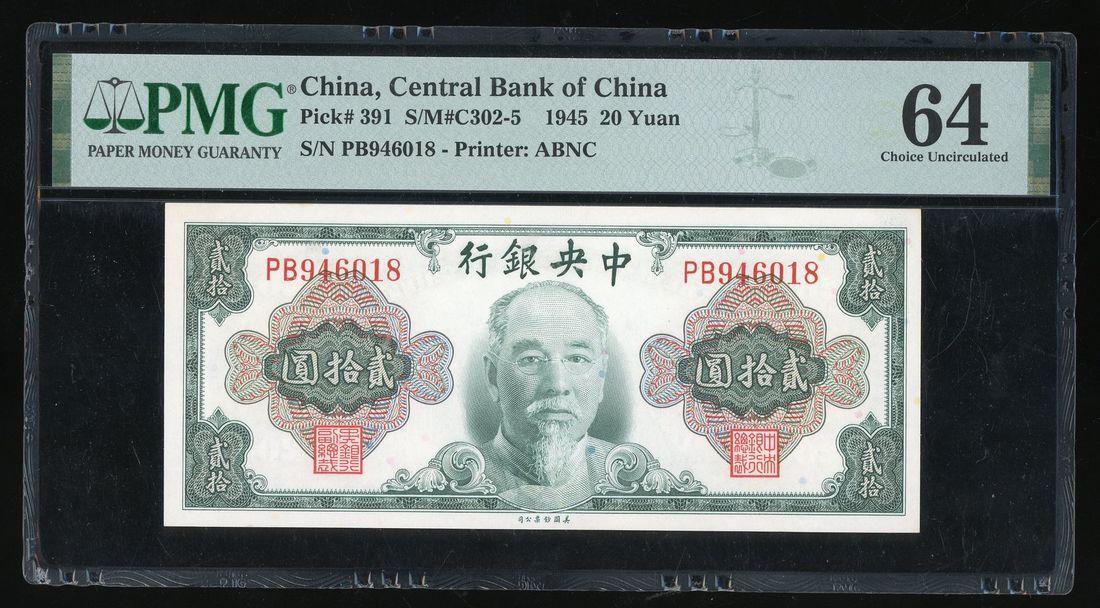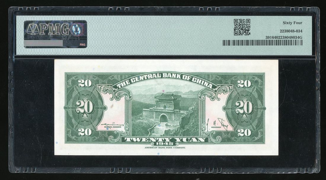 Central Bank of China, 20 yuan, 1945, serial number PB946018, (Pick 391), PMG 64
