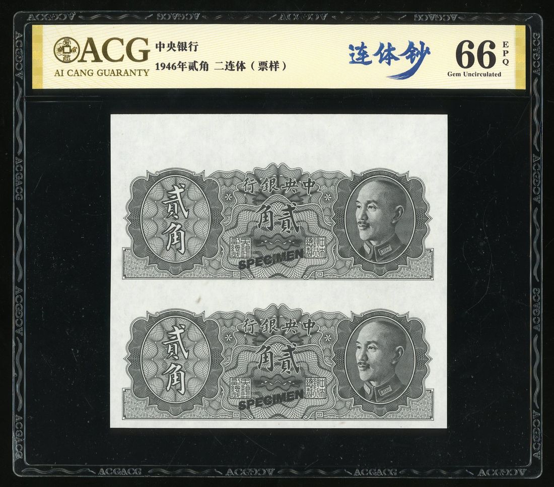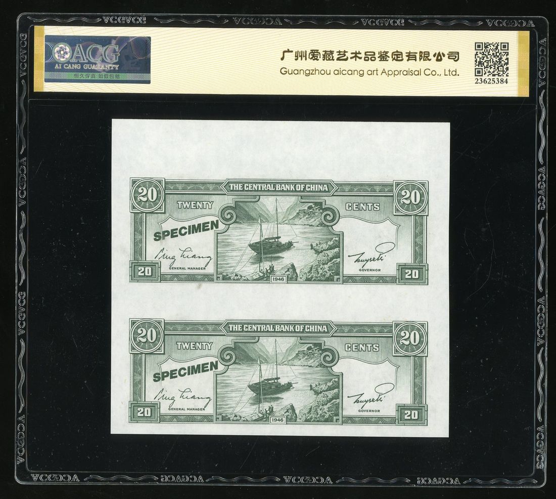 Central Bank of China, an uncut pair of specimen 20 cents, 1946, (Pick 395as2), ACG 66EPQ