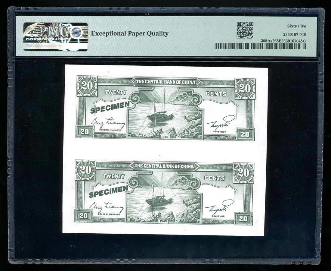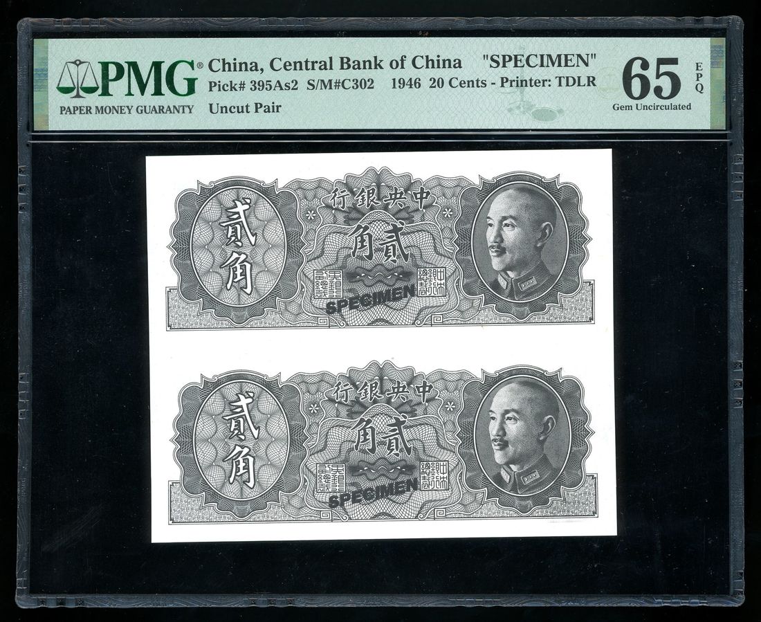 Central Bank of China, an uncut pair of specimen 2 jiao, 1946, (Pick 395As2), PMG 65EPQ
