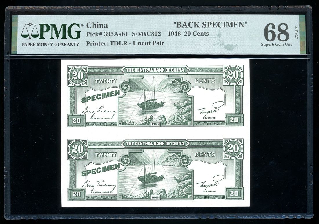 Central Bank of China, an uncut pair of uniface reverse specimen of 20 cents, 1946, green, sampan at centre,
