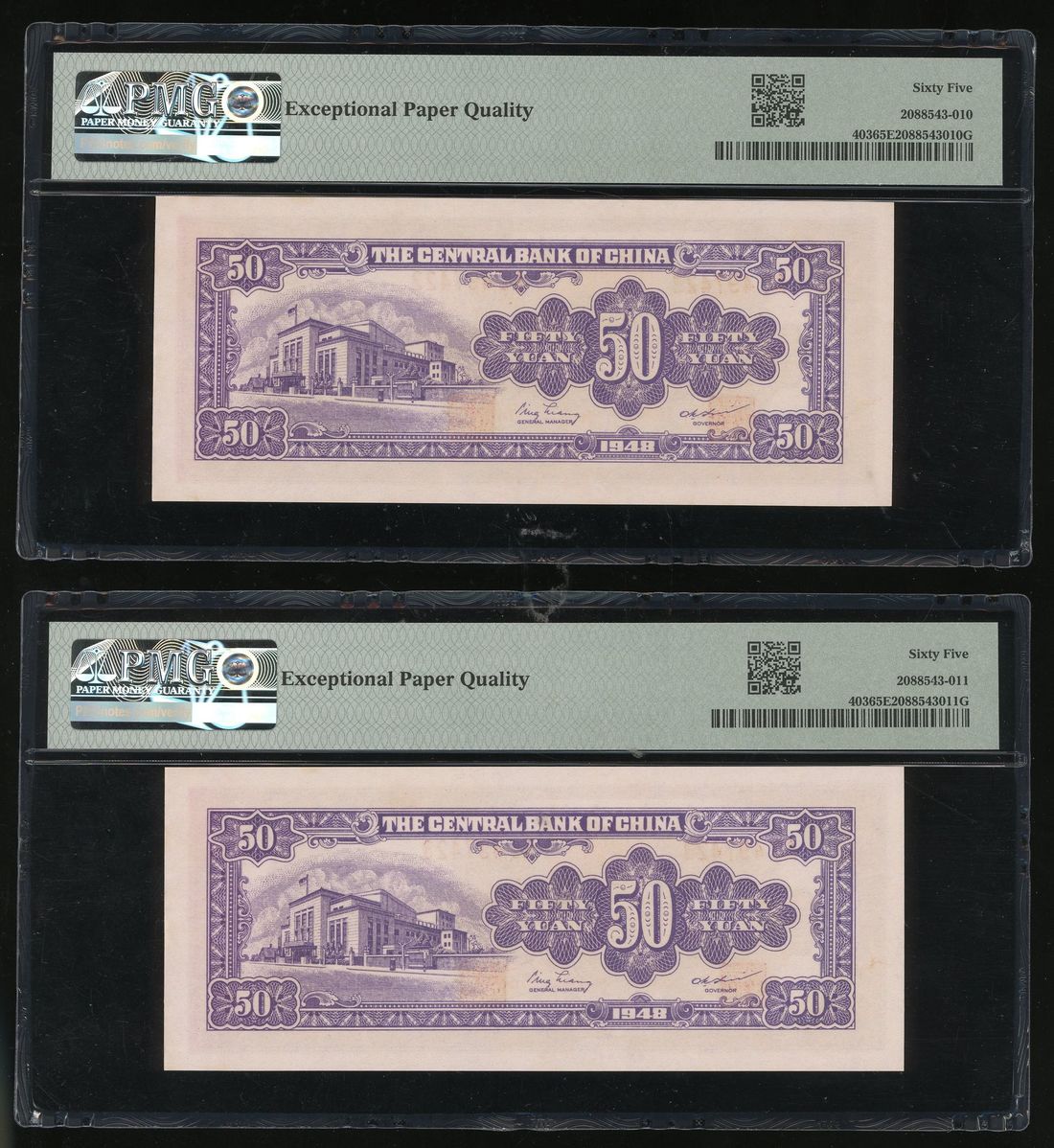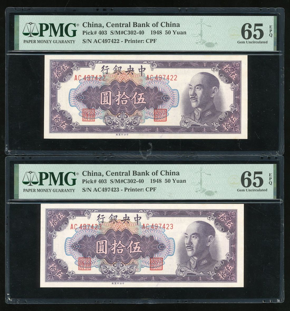 Central Bank of China, consecutive pair 50 yuan, 1948, serial numbers AC497422/23, (Pick 403), both PMG 65EPQ (2)
