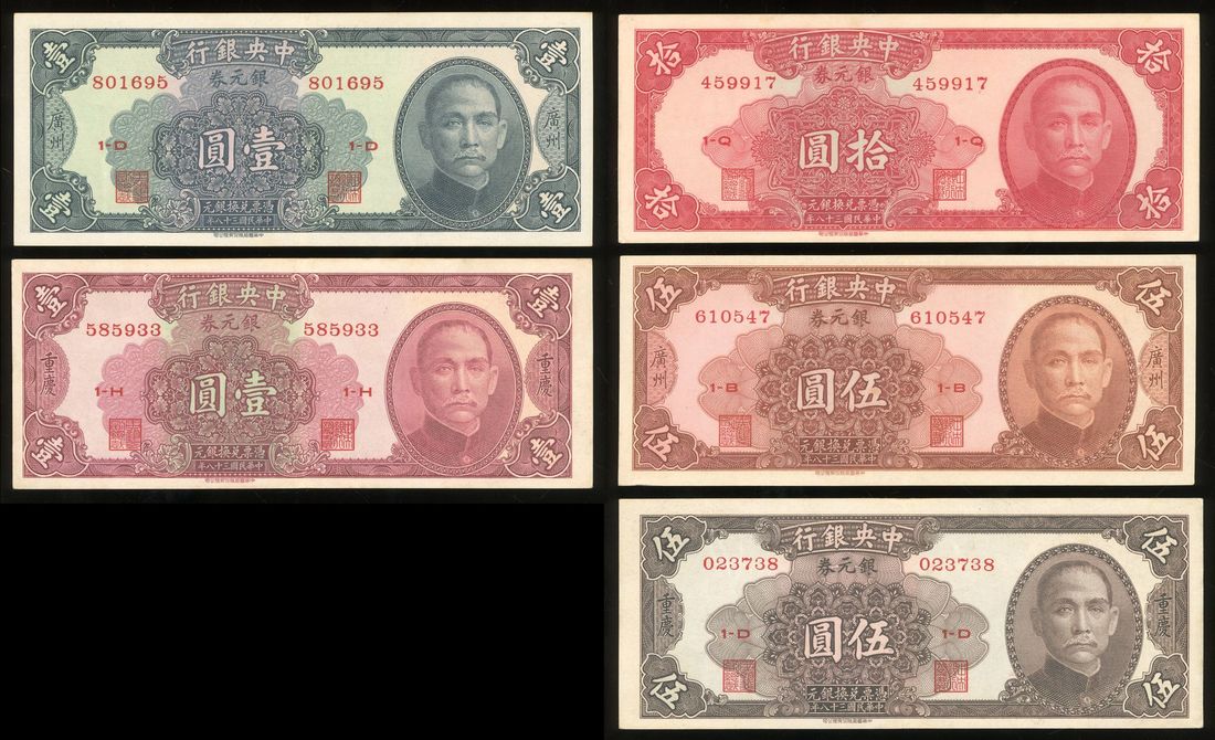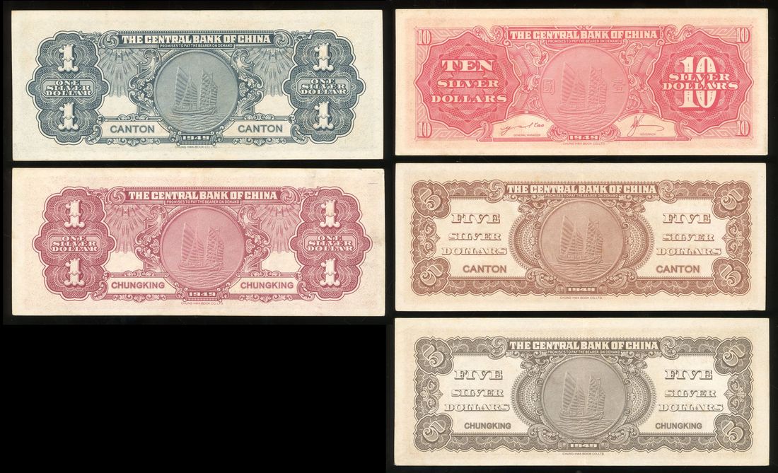 Central Bank of China, a group of 5x 1949 silver dollar issues, including: $1 (Chungking), $1 (Canton), $5 (Chungking), $5 (Canton) and $10,