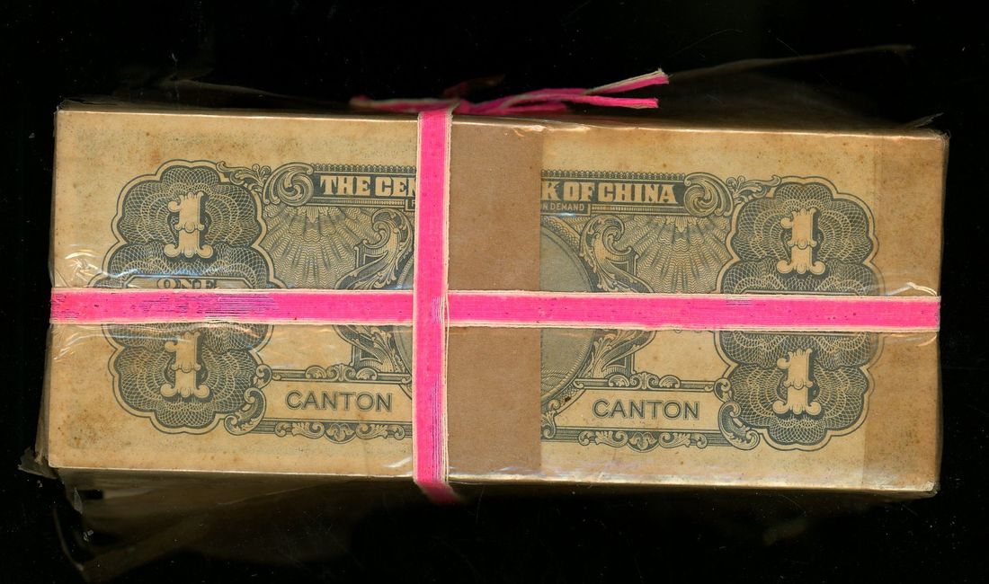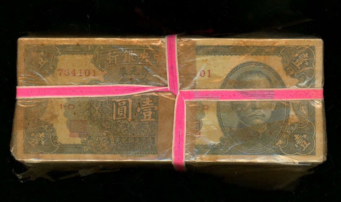 Central Bank of China, consecutive 1 silver dollar (1000), Year 38 (1949), serial numbers 734101-735000, (Pick 441), as issued in original bundle. Rarely seen in this format (1000)