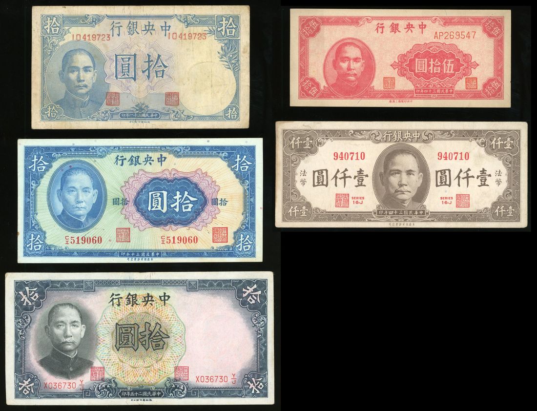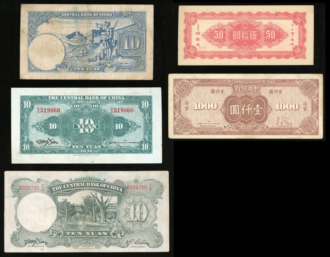 Central Bank of China, a group of 5x, consists of 3x 10 yuan, Year 25(1936), Year 30(1941) and Year 31(1942), 1x 50 yuan, Year 34(1945), printed by Central Mint Shanghai branch, and 1000 yuan, Year 34(1945), serial numbers X036730 Y/J, CI519060, 10419723, AP269547 and 940710, about fine to very fine, viewing recommended, sold as seen no return (5).