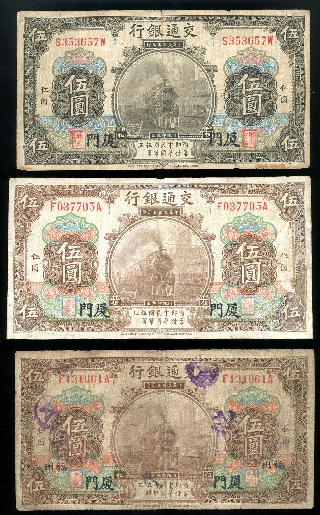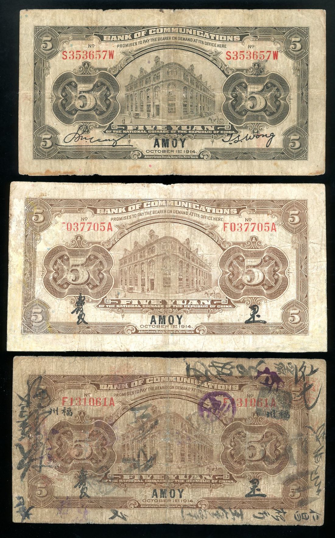 Bank of Communications, China, 5 yuan (3), 1914, Amoy and Foochow, serial number F131061A, F037705A and S353657W, (Pick 117a, 117f), the Foochow issue with multiple brush writing on reverse, generally about fine to good fine.(3)