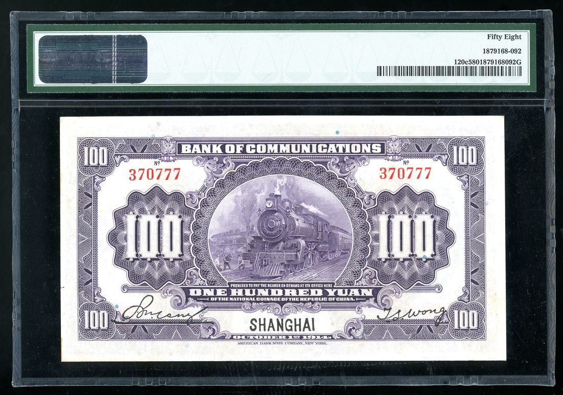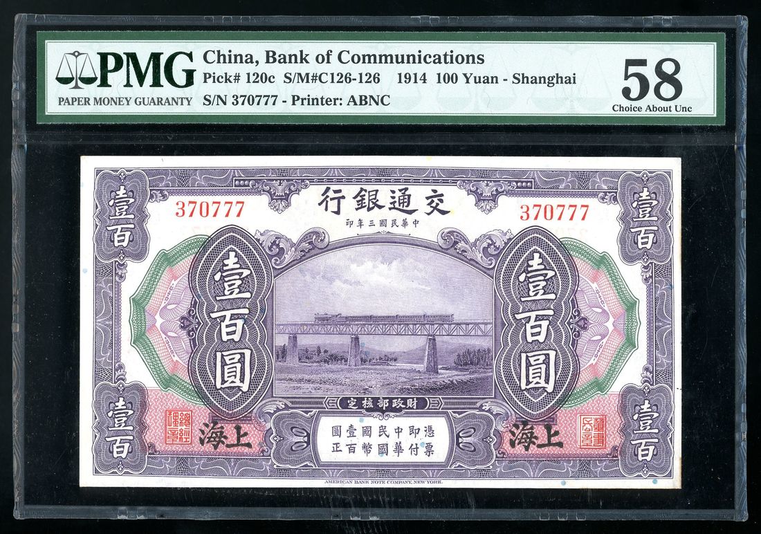 Bank of Communications, China, 100 yuan, Year 3 (1914), Shanghai, serial number 370777, (Pick 120c), PMG 58