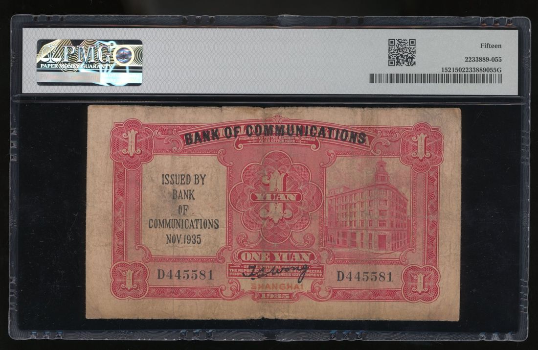 Bank of Communications, China, 1 yuan, Shanghai, Year 24(1935), overprinted on The National Industrial Bank of China, serial number D445581, (Pick 152), PMG 15 Choice Fine.