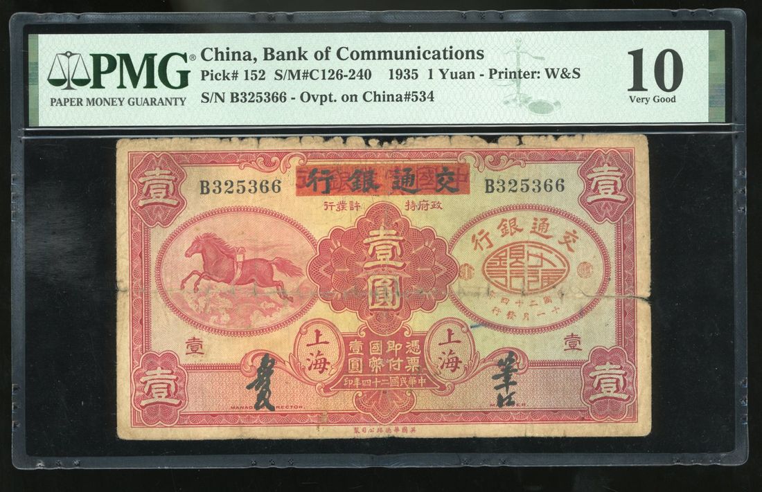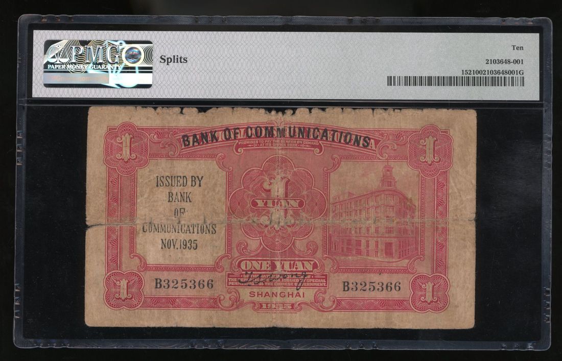 Bank of Communications, China, 1 yuan, Shanghai, Year 24(1935), overprinted on The National Industrial Bank of China, serial number B325366, (Pick 152), PMG 10 Very Good (Splits).