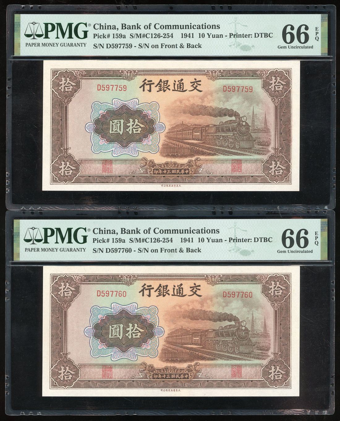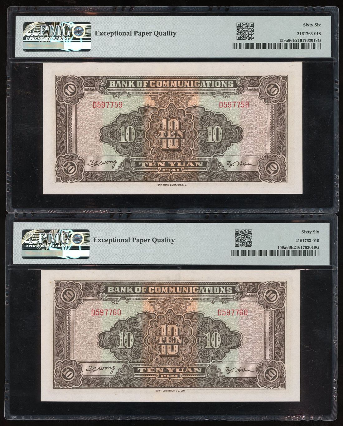 Bank of Communications, China, consecutive pair 10 yuan, Year 30 (1941), serial numbers D597759/60, (Pick 159a), both PMG 66EPQ (2)