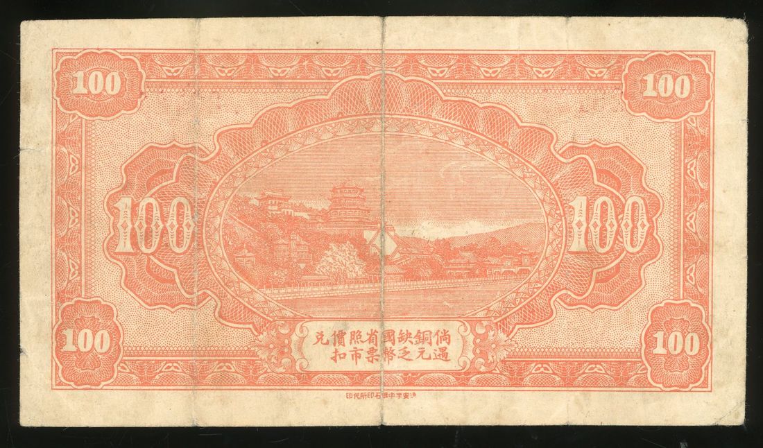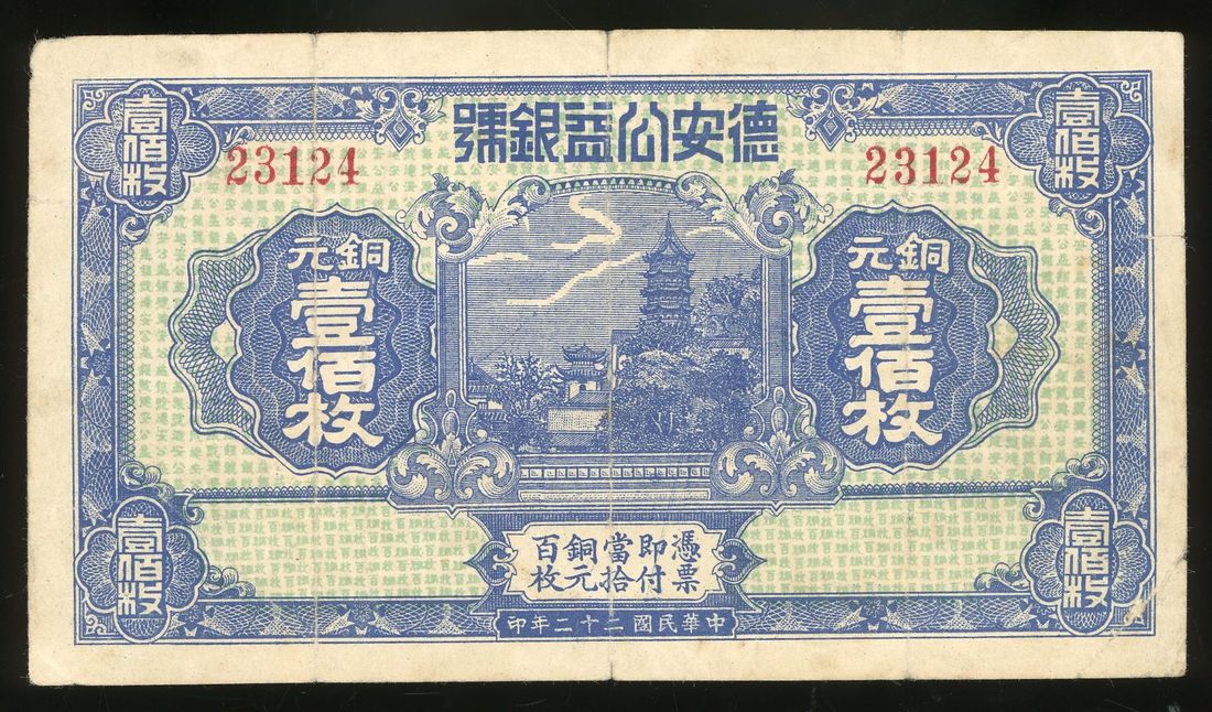 De An Gong Yi Yin Hao, Private Issue, China, 100 cash, Year 22 (1933), serial number 23124, fine