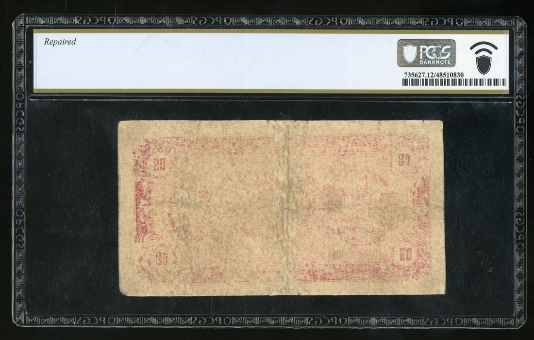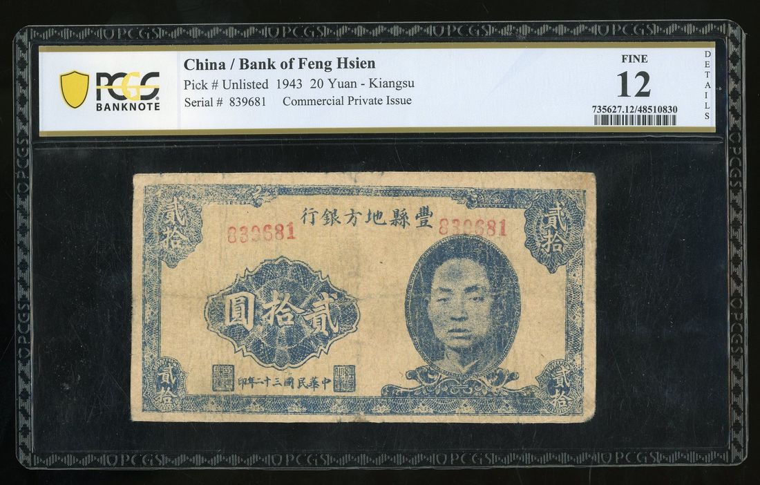 Bank of Feng Hsien, Kiangsu Province, Private Issue, China, 20 yuan, Year 32 (1943), serial number 839681, (Pick Unlisted), PCGS 12, Repaired