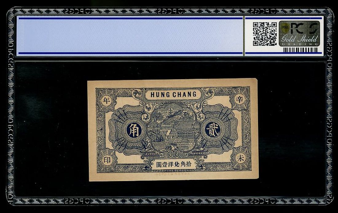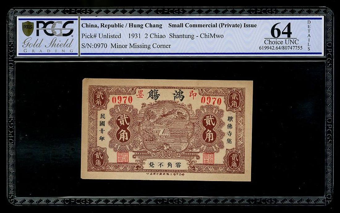 Hung Chang, Private Issue, China, 2 chiao, Shantung-ChiMwo, Year 20(1931), serial number 0970, (Pick unlisted), PCGS Gold Shield Grading 64 Details (Minor Missing Corner).