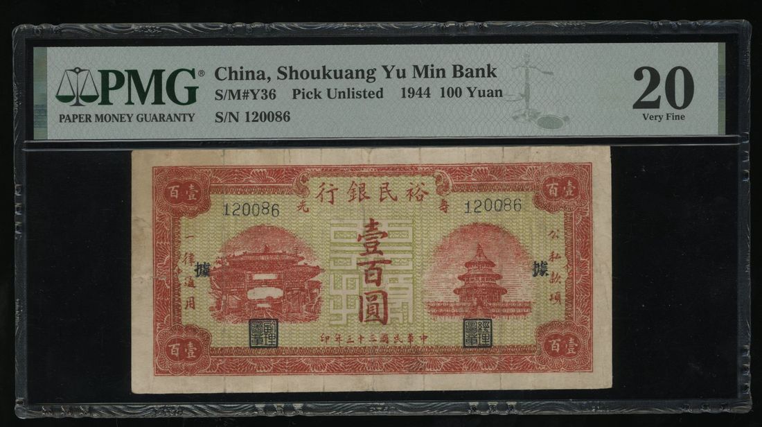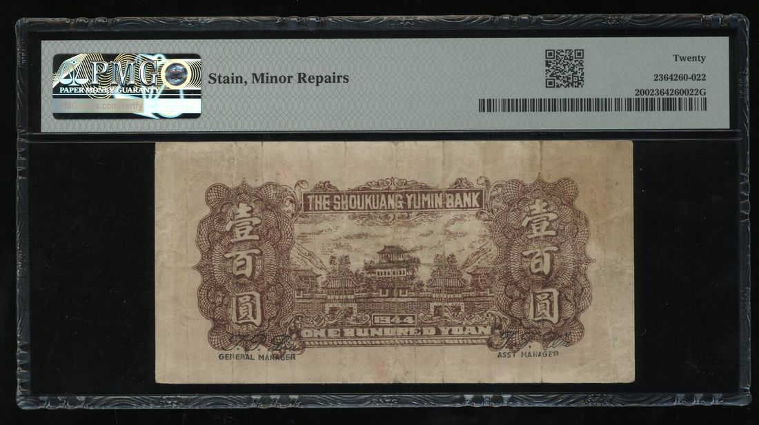 Shoukuang Yu Min Bank, 100 yuan, 1944, serial number 120086, (Pick unlisted), PMG 20, stain, minor repairs.