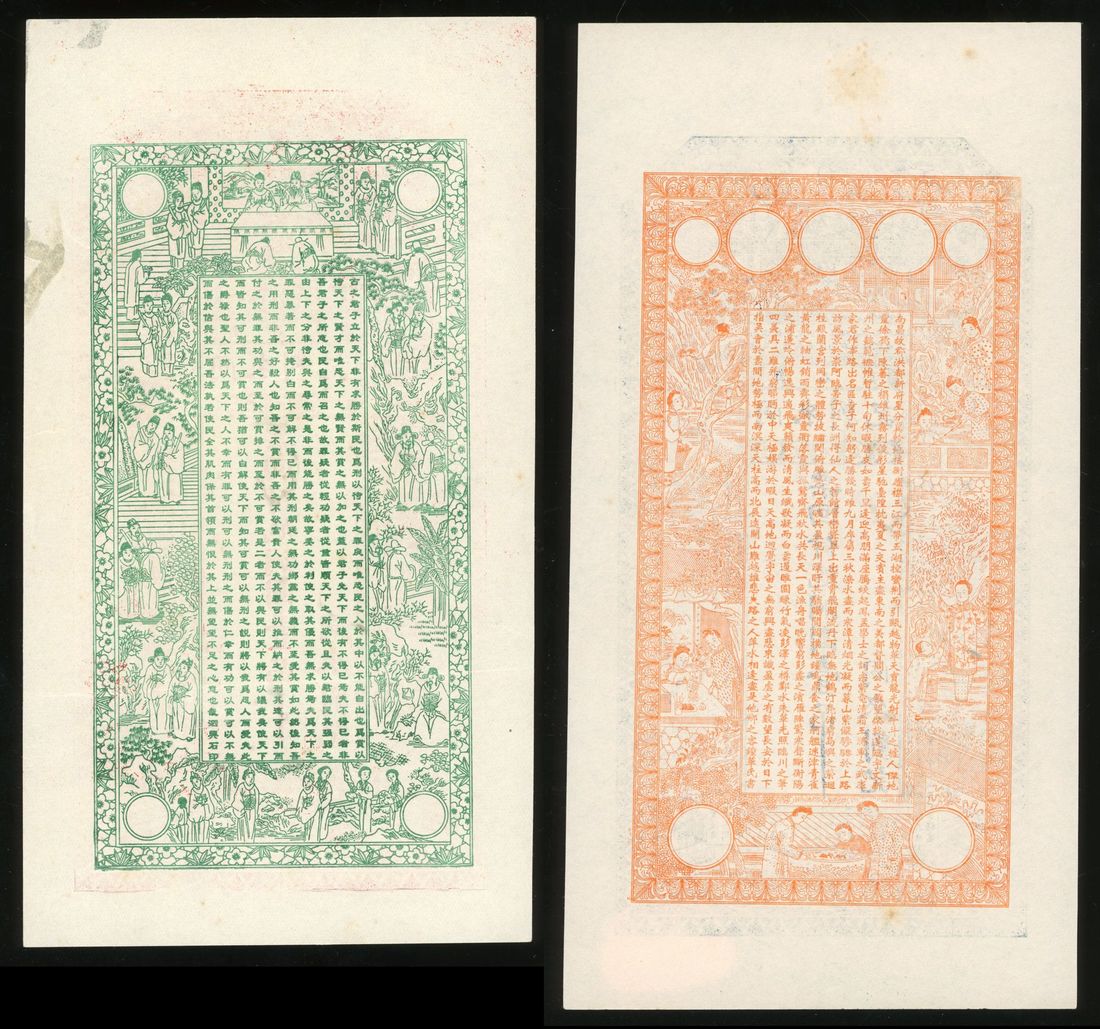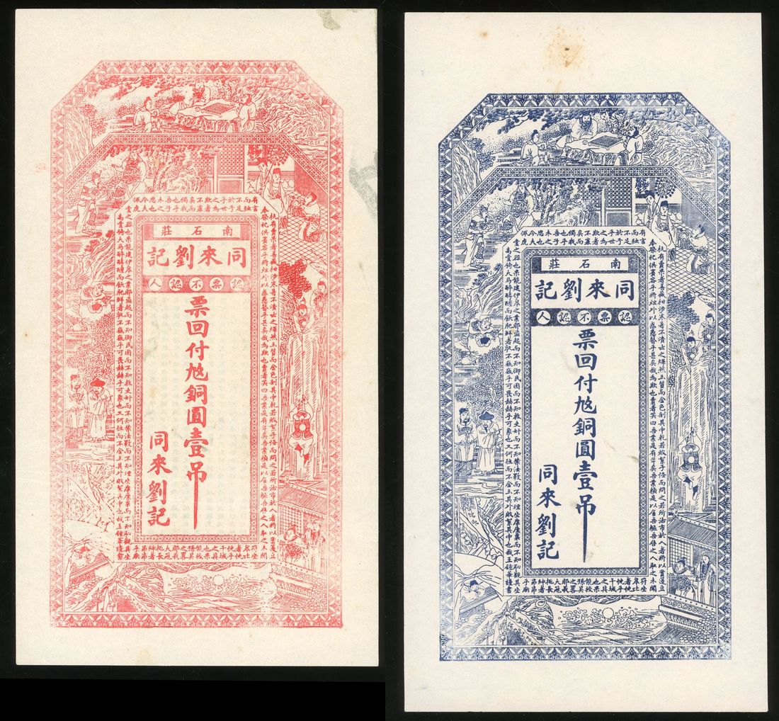 Tong Lai Liu Ji, Shandong Province, Private Issue, China, a pair of remainder 1 tiao, ND, different colours on both sides,