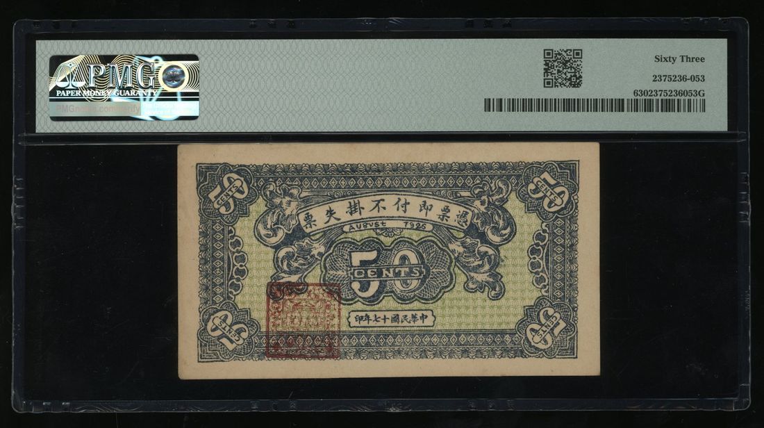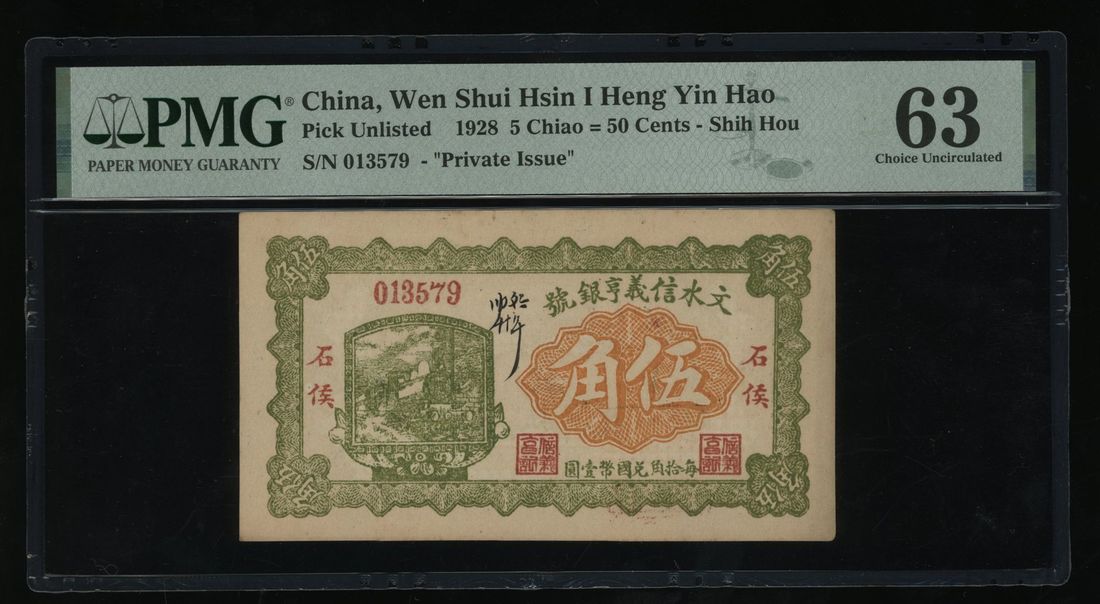 Wen Shui Hsin I Heng Yin Hao, Private Issue, China, 50 cents, 1928, Shih Hou, Shansi, serial number 013579, (Pick unlisted), PMG 63.